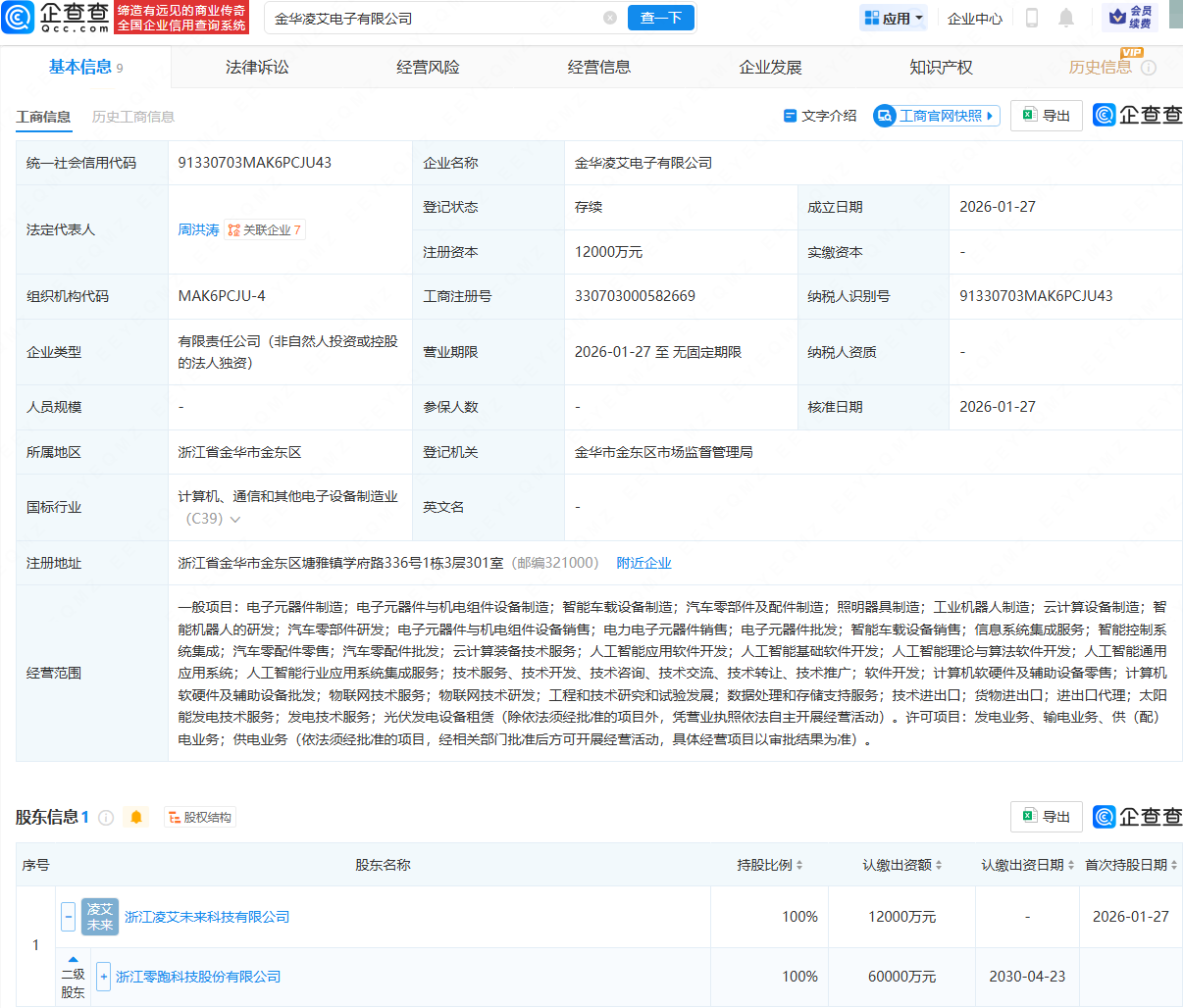 企查查APP显示,近日,金华凌艾电子有限公司成立,法定代表人为周洪涛,注册资本为1.2亿元,经营范围包含:电子元器件制造;智能车载设备制造;汽车零部件及配件制造;云计算设备制造;智能机器人的研发等。企查查股权穿透显示,该公司由零跑汽车(09863.HK)间接全资持股。