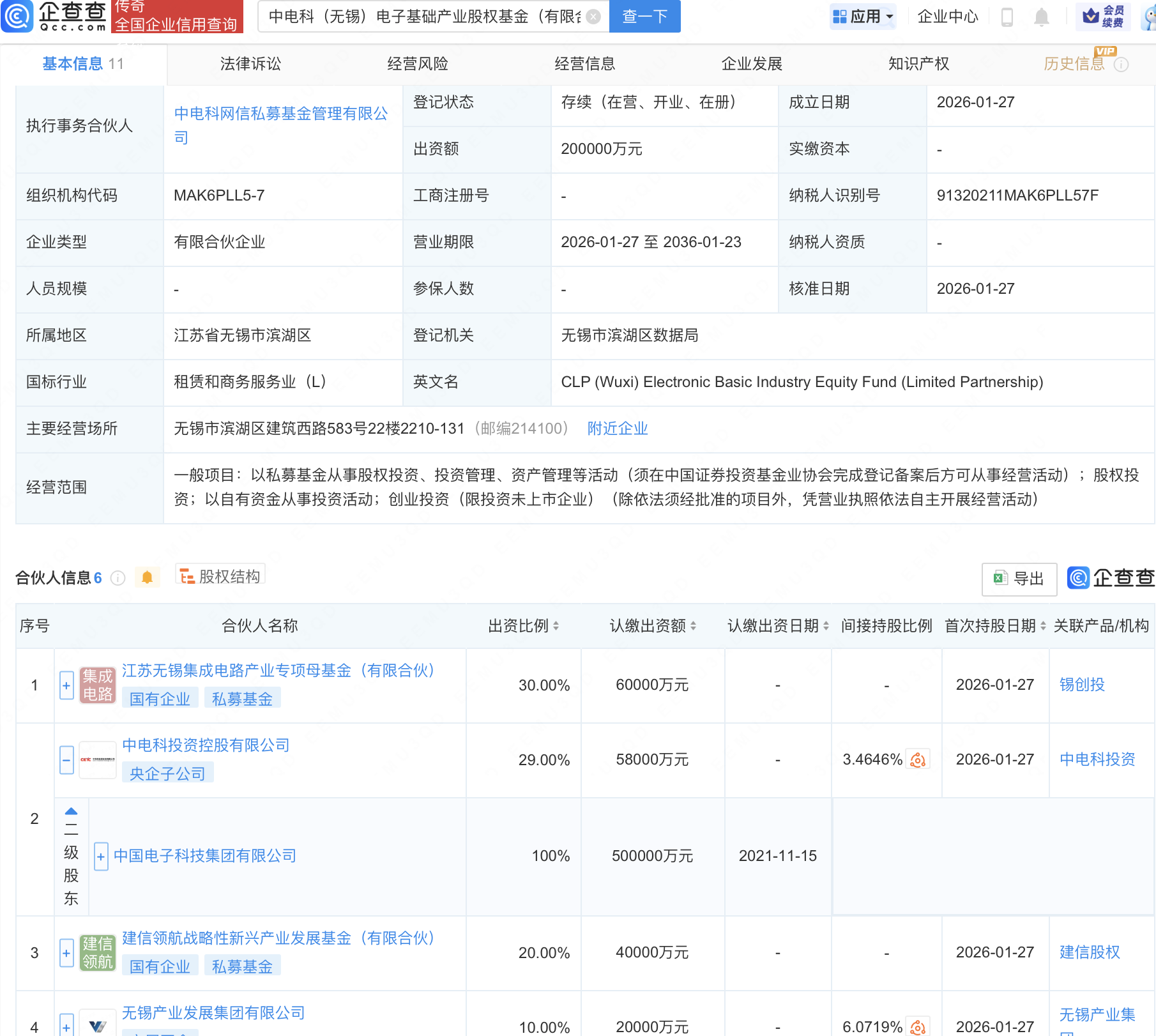 企查查APP显示,近日,中电科(无锡)电子基础产业股权基金(有限合伙)成立,出资额20亿元,经营范围包含:以私募基金从事股权投资、投资管理、资产管理等活动。企查查股权穿透显示,该企业由中国电子科技集团有限公司全资子公司中电科投资控股有限公司、江苏无锡集成电路产业专项母基金(有限合伙)等共同出资。
