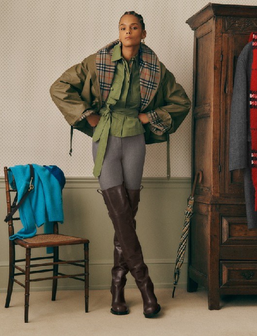 女士系列聚焦于功能性与美学的平衡,短款Trench风衣采用轻量化处理,搭配绗缝夹克与羽绒设计,既保留防风性能又提升穿着舒适度。下装选择上,格纹短裙与嘎巴甸面料工装裤形成鲜明对比,前者延续学院风,后者则注入工装元素。配饰方面,B Clip手袋以简约线条成为焦点,Bloomsbury托特包通过粗花呢格纹增添文艺气质,马术灵感Cavalier靴可搭配马裤或花卉连衣裙,满足多场景穿搭需求。