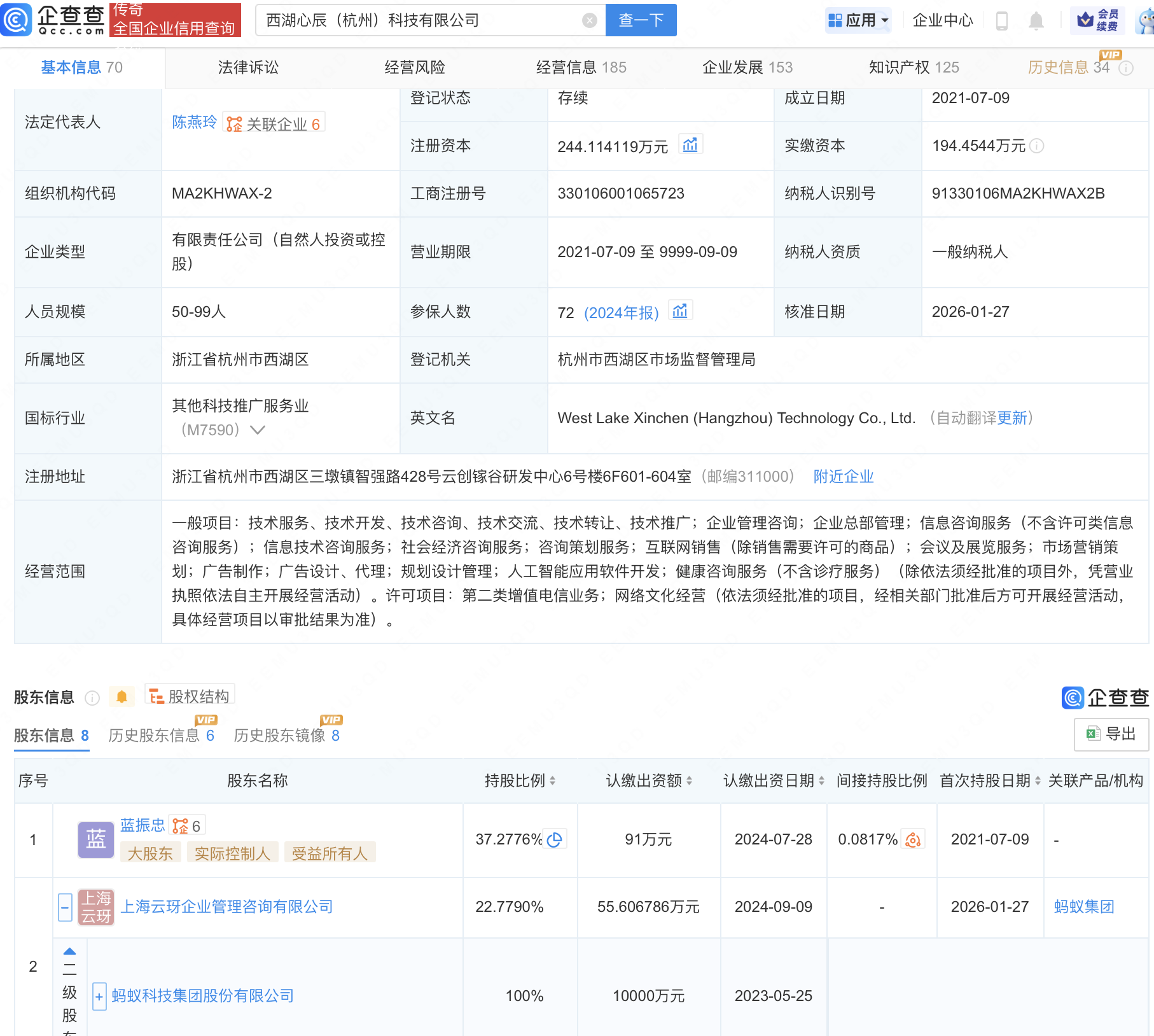 企查查APP显示,近日,西湖心辰(杭州)科技有限公司发生工商变更,新增蚂蚁科技集团股份有限公司全资子公司上海云玡企业管理咨询有限公司为股东。企查查信息显示,该公司成立于2021年,经营范围包含:规划设计管理;人工智能应用软件开发;健康咨询服务(不含诊疗服务)等。据其官网,西湖心辰致力于AI大模型技术的探索与研究,专注于人工智能服务的创新与应用。