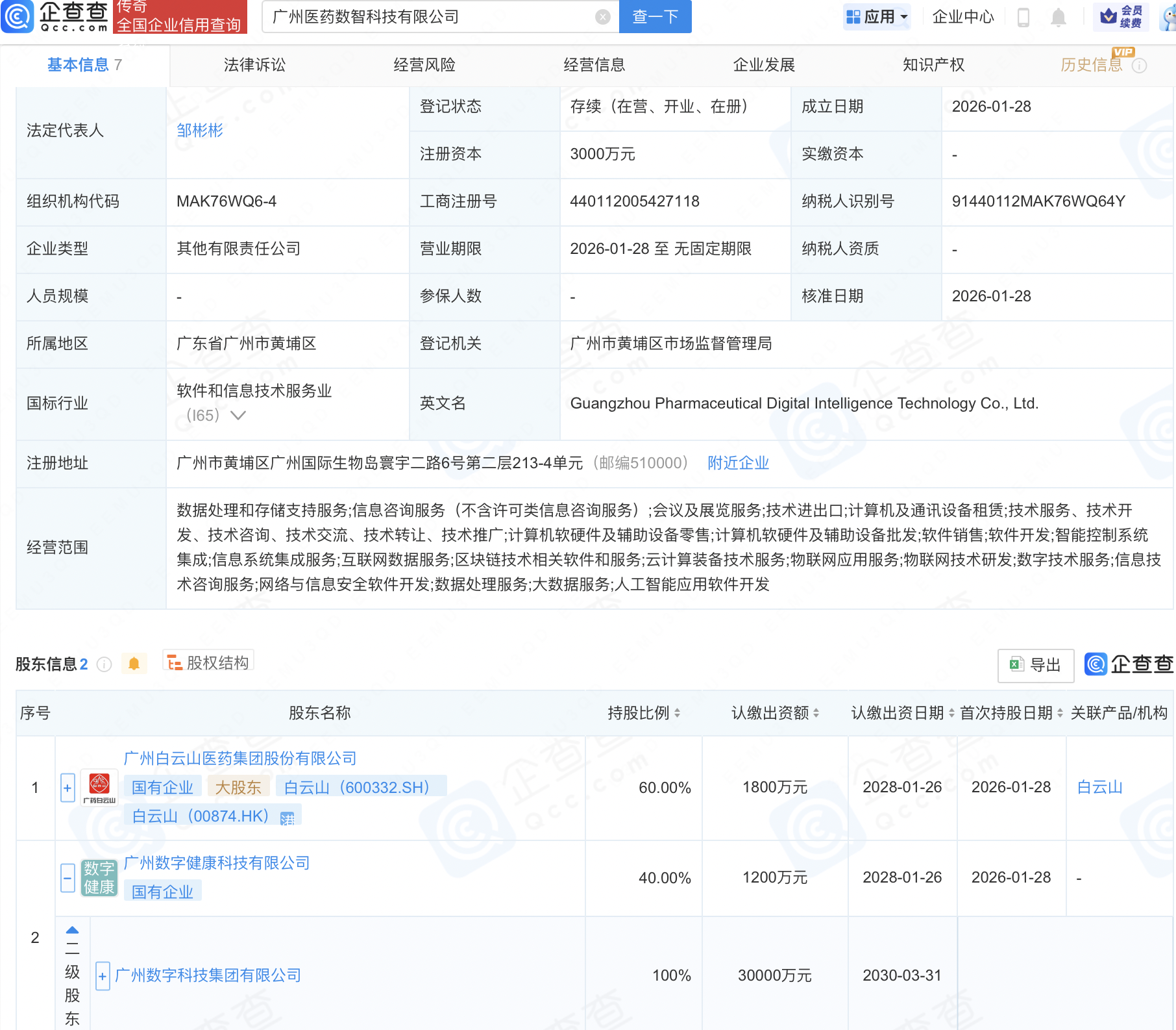 企查查APP显示,近日,广州医药数智科技有限公司成立,注册资本3000万元,经营范围包含:网络与信息安全软件开发;数据处理服务;大数据服务;人工智能应用软件开发等。企查查股权穿透显示,该公司由白云山(600332)、广州数字科技集团有限公司全资子公司广州数字健康科技有限公司共同持股。
