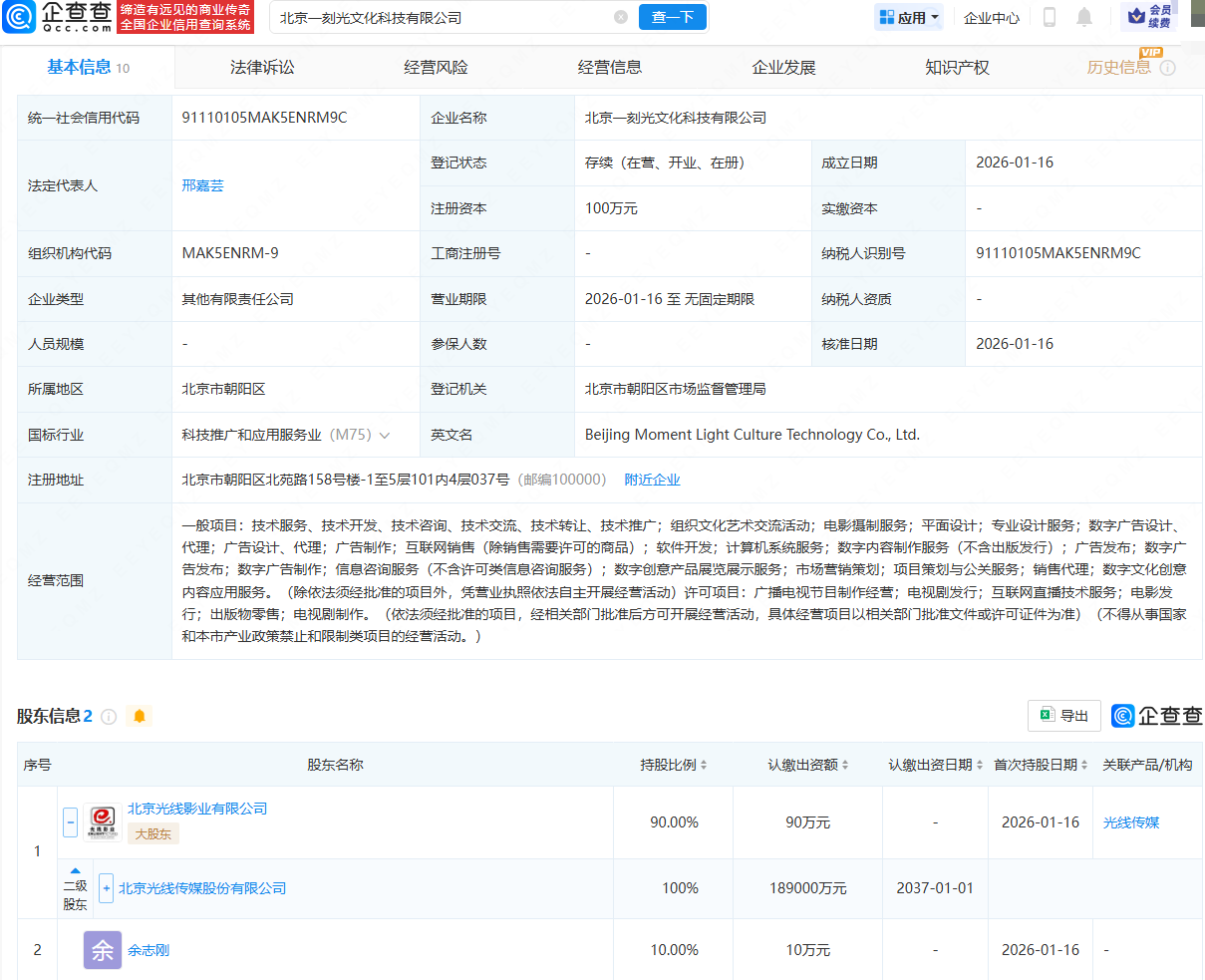 企查查APP显示,近日,北京一刻光文化科技有限公司成立,法定代表人为邢嘉芸,经营范围包含:电影摄制服务;广播电视节目制作经营;电视剧发行;互联网直播技术服务;电影发行;出版物零售等。企查查股权穿透显示,该公司由光线传媒(300251)全资子公司北京光线影业有限公司、余志刚共同持股。