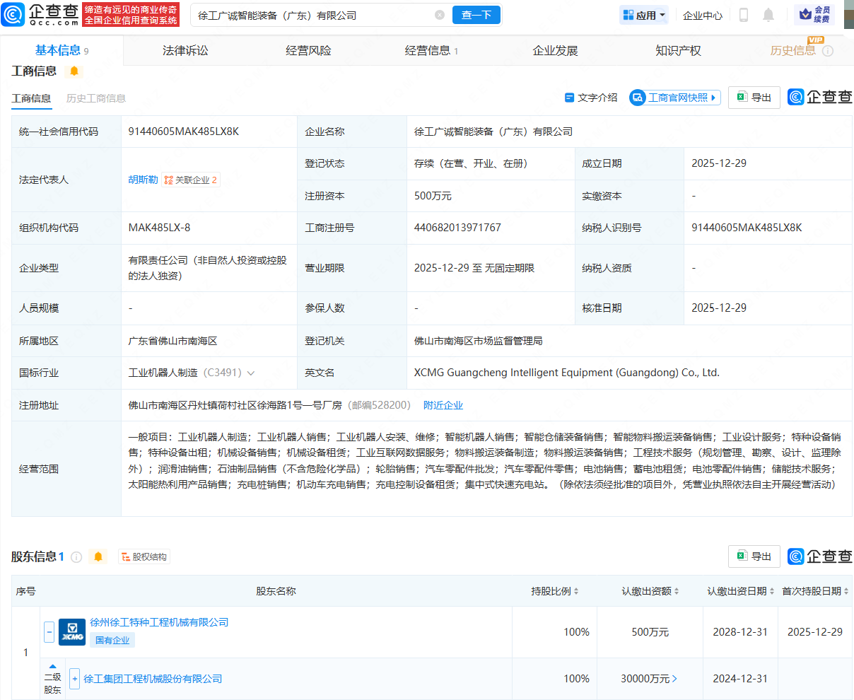 企查查APP显示,近日,徐工广诚智能装备(广东)有限公司成立,法定代表人为胡斯勒,经营范围包含:工业机器人制造;工业机器人销售;智能机器人销售;智能仓储装备销售;电池销售等。企查查股权穿透显示,该公司由徐工机械(000425)间接全资持股。