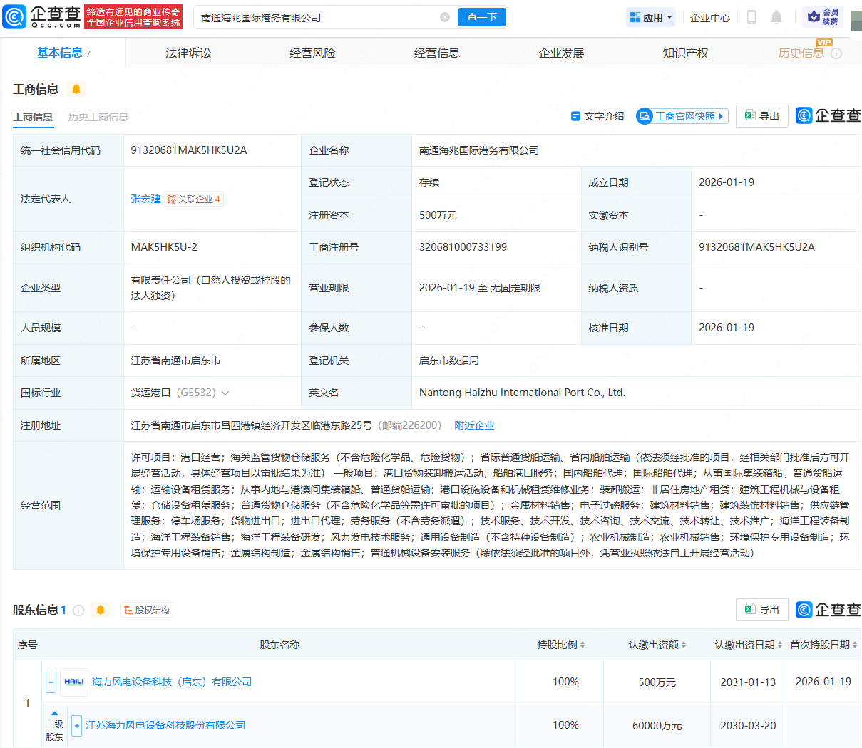 企查查APP显示,近日,南通海兆国际港务有限公司成立,法定代表人为张宏建,经营范围包含:港口经营;海关监管货物仓储服务;船舶港口服务;国内船舶代理;国际船舶代理等。企查查股权穿透显示,该公司由海力风电(301155)间接全资持股。
