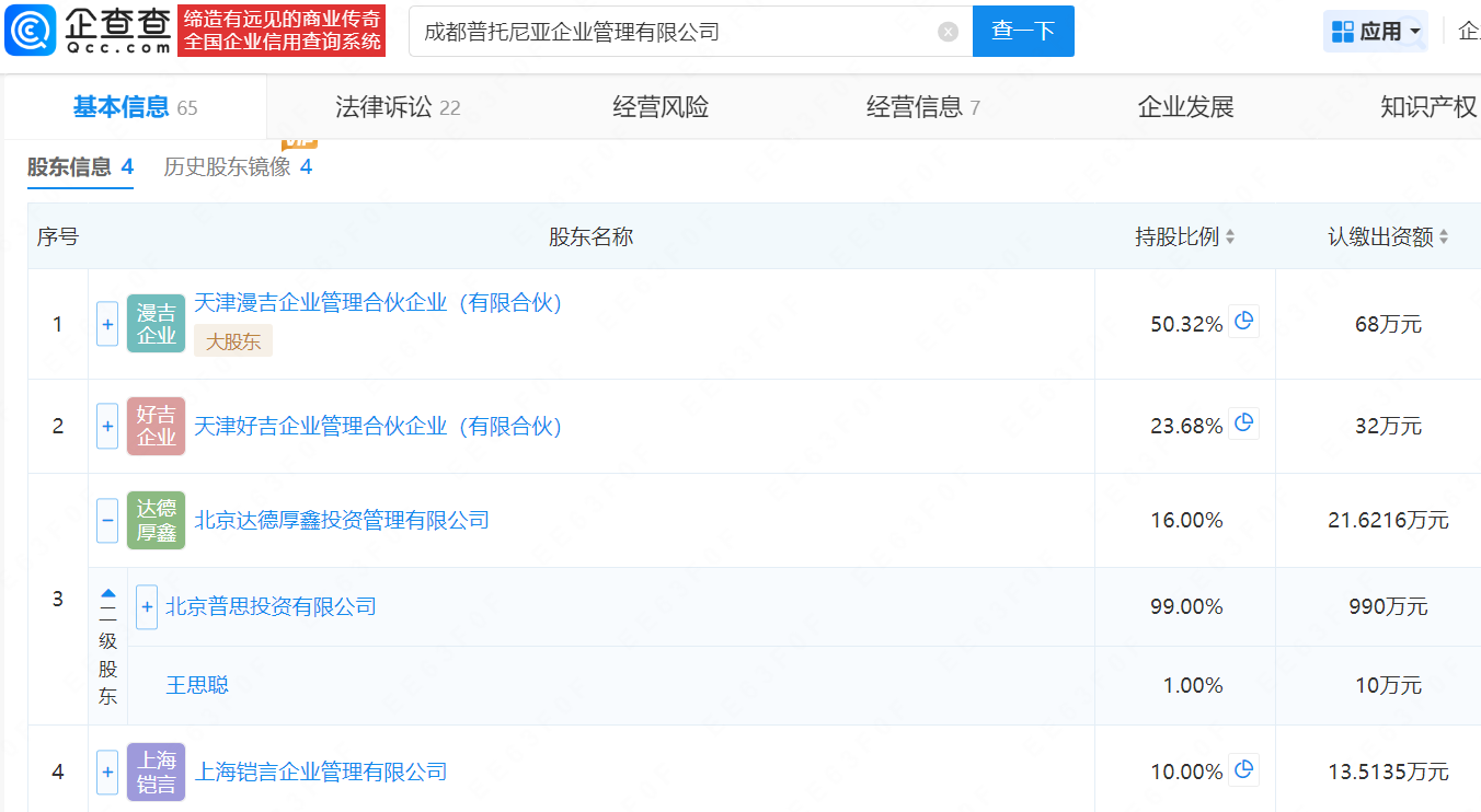 企查查APP显示,近日,成都普托尼亚企业管理有限公司发生工商变更,新增王思聪名下北京达德厚鑫投资管理有限公司为股东,同时注册资本由约113.5万增至约135.1万元。