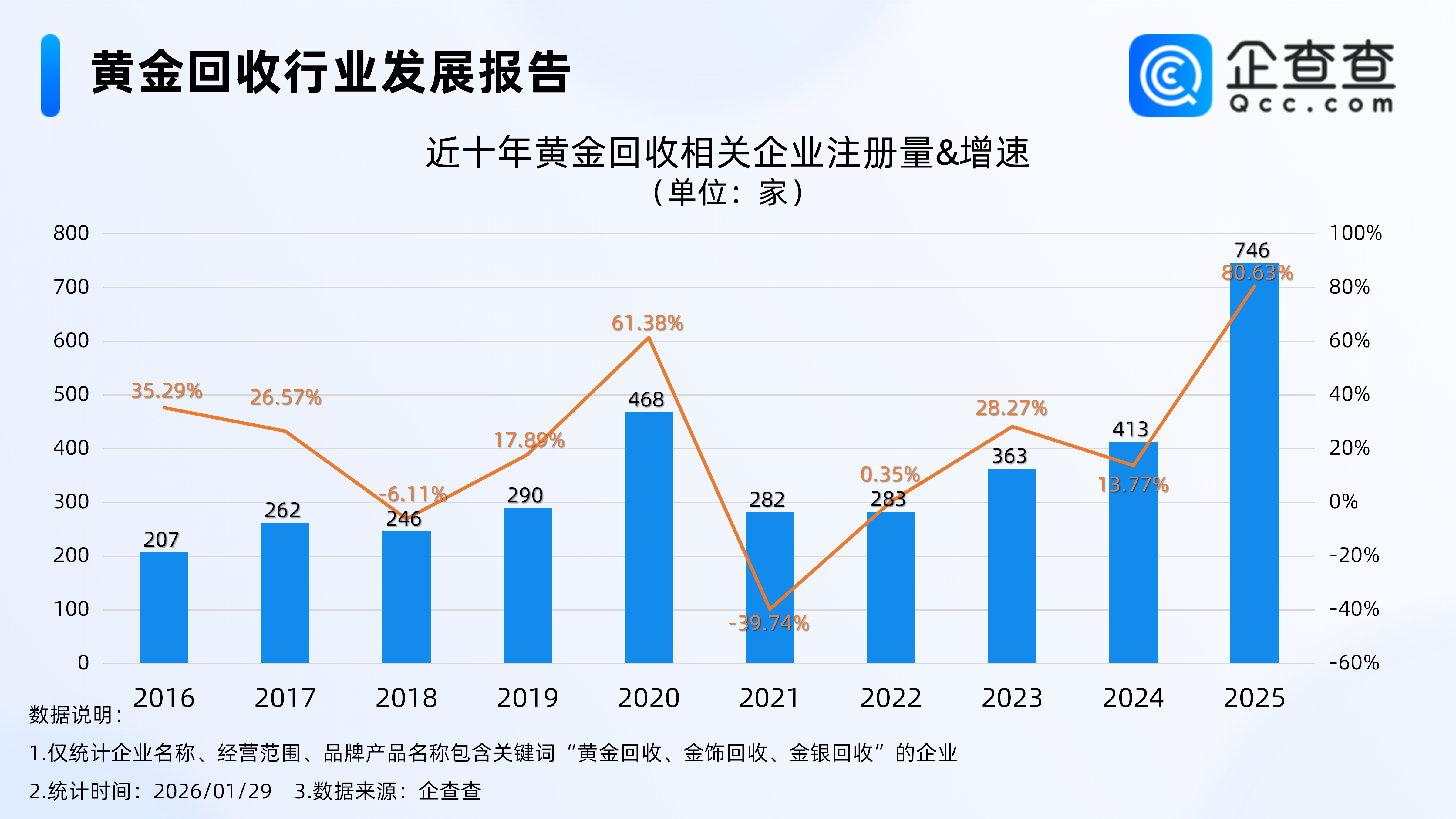 企查查数据显示,截至1月29日,国内现存黄金回收相关企业2913家。近十年相关企业呈整体增长态势,其中2020年全年注册量同比增长61.38%至468家相关企业,达第一个注册量峰值。2025年全年注册量同比快速增长80.63%至746家黄金回收相关企业,创近十年注册量及增速双峰值。截至目前,今年已注册69家相关企业。