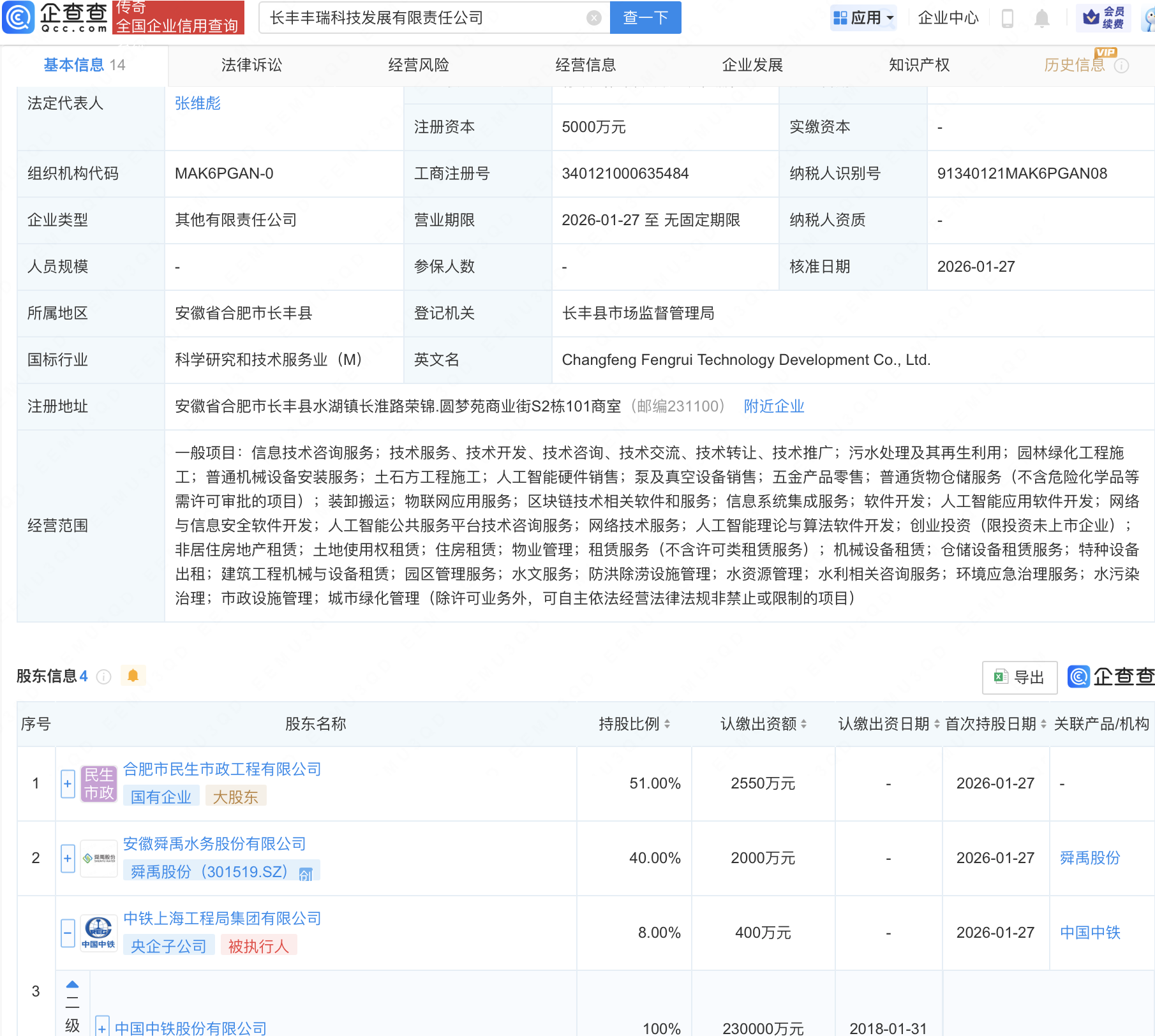 企查查APP显示,近日,长丰丰瑞科技发展有限责任公司成立,注册资本5000万元,经营范围包含:人工智能应用软件开发;网络与信息安全软件开发;人工智能公共服务平台技术咨询服务;人工智能理论与算法软件开发等。企查查股权穿透显示,该公司由舜禹股份(301519)、中国中铁(601390)全资子公司中铁上海工程局集团有限公司等共同持股。