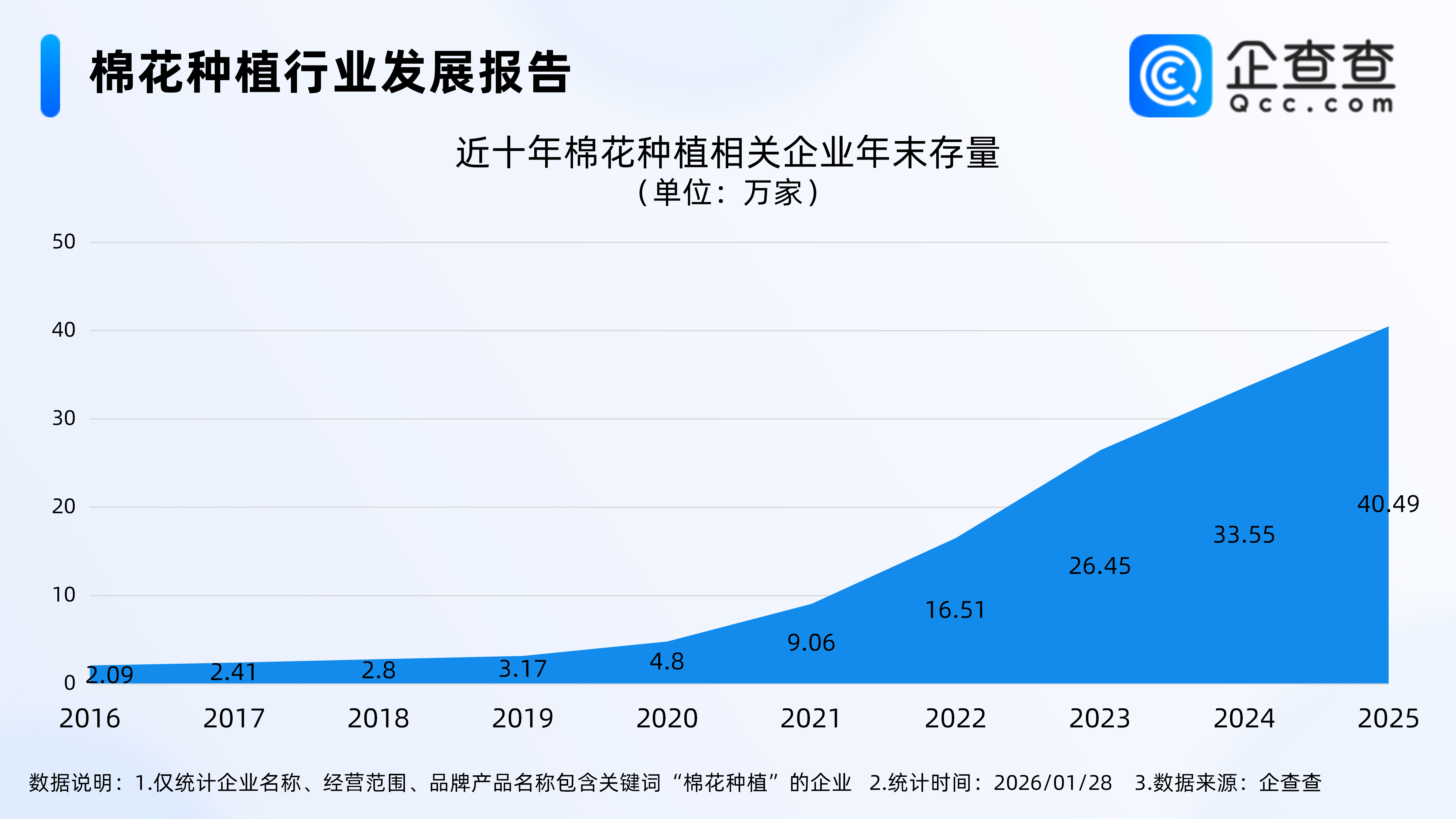企查查数据显示,截至1月28日,国内现存棉花种植相关企业41.02万家。近十年棉花种植相关企业存量规模持续增长,其中2022年末相关企业存量规模首次突破万家,达16.51万家。注册量方面,2025年全年注册8.88万家棉花种植相关企业,截至目前,今年已注册0.63万家。