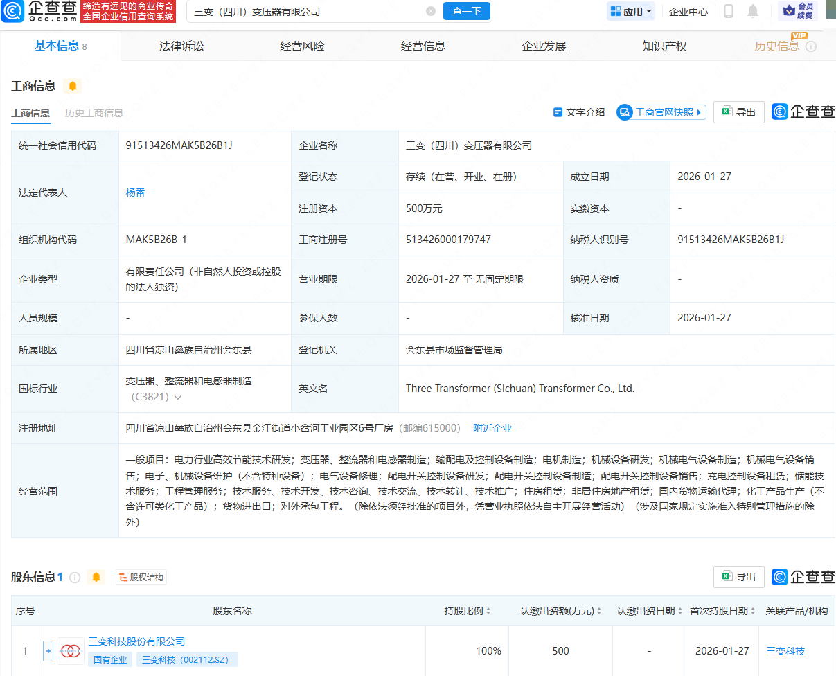 企查查APP显示,近日,三变(四川)变压器有限公司成立,法定代表人为杨番,经营范围包含:电力行业高效节能技术研发;变压器、整流器和电感器制造;输配电及控制设备制造;电机制造等。企查查股权穿透显示,该公司由三变科技(002112)全资持股。