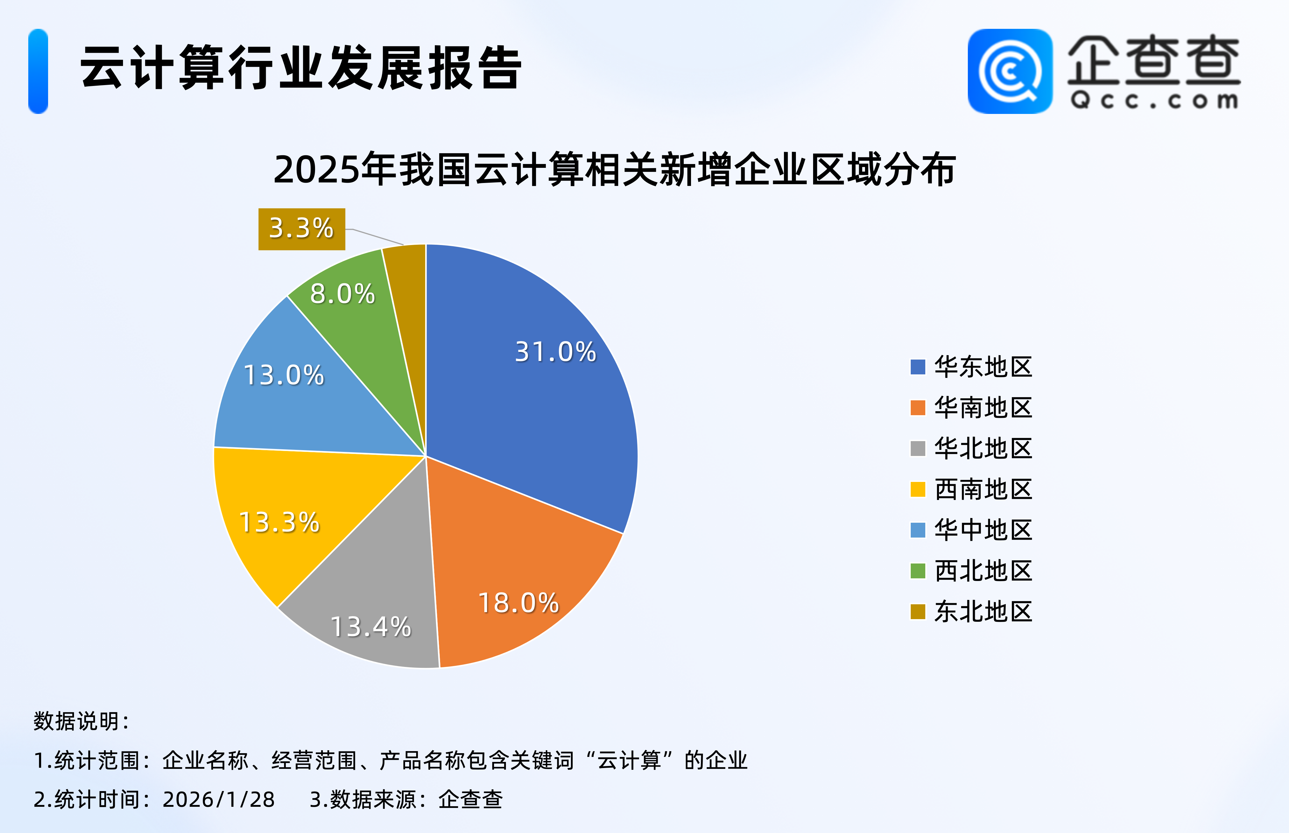 企查查数据显示,2025年新注册的17万家云计算相关企业中,超三成位于华东地区,其次是华南、华北地区,分占18.0%、13.4%;东北地区云计算相关企业相对较少,占比3.3%。