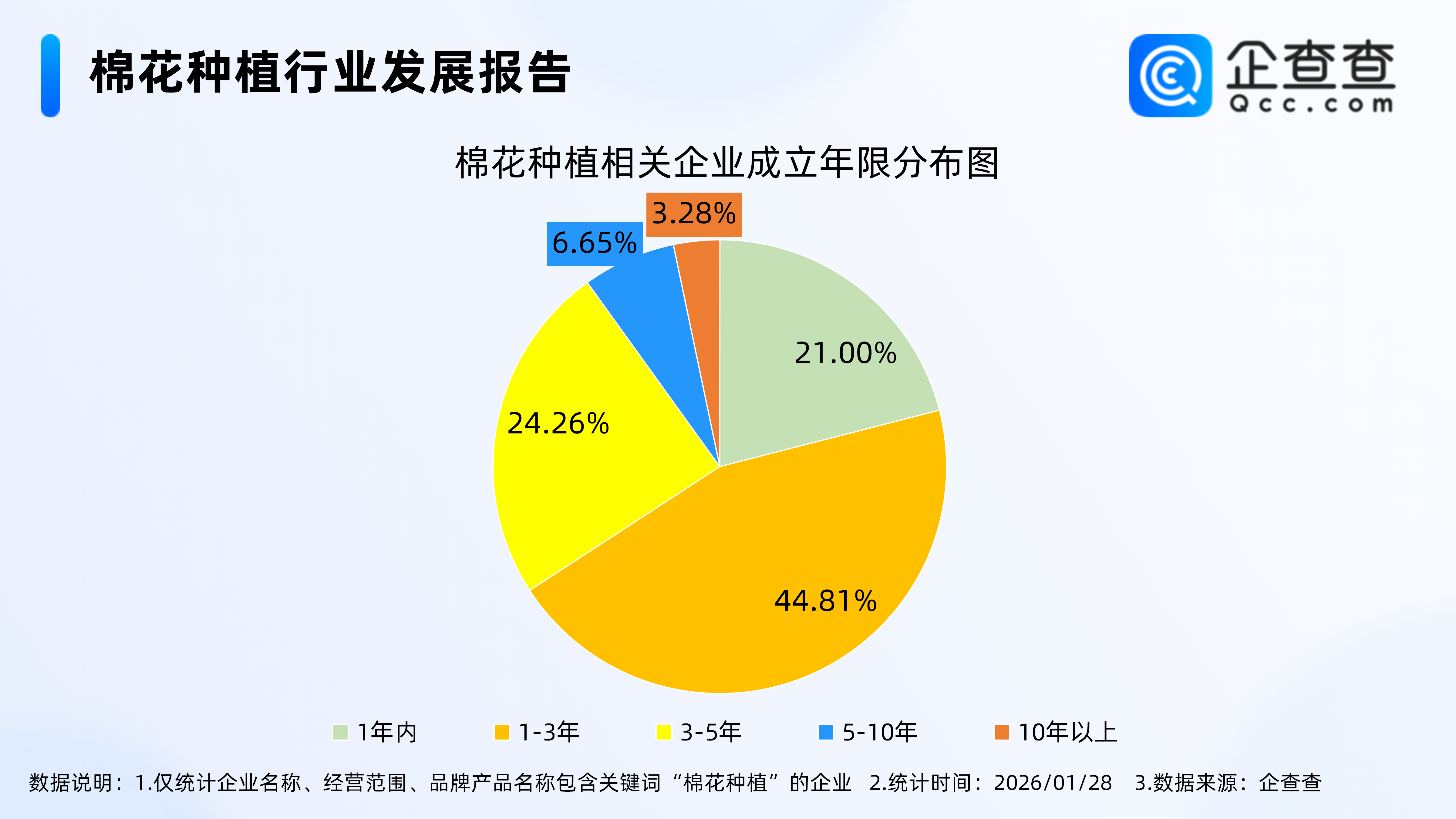 企查查数据显示,从经营时间来看,近七成棉花种植相关企业成立于3年内,其中,成立年限在1-3年的棉花种植相关企业最多,占比44.81%,成立于1年内的棉花种植相关企业占比21.00%,此外,成立年限在3-5年的相关企业占比24.26%。