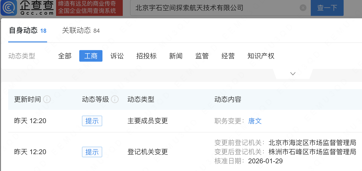 企查查APP显示,北京宇石空间航天科技有限公司全资子公司北京宇石空间探索航天技术有限公司发生工商变更,登记机关由北京市海淀区市场监督管理局变更为株洲市石峰区市场监督管理局。