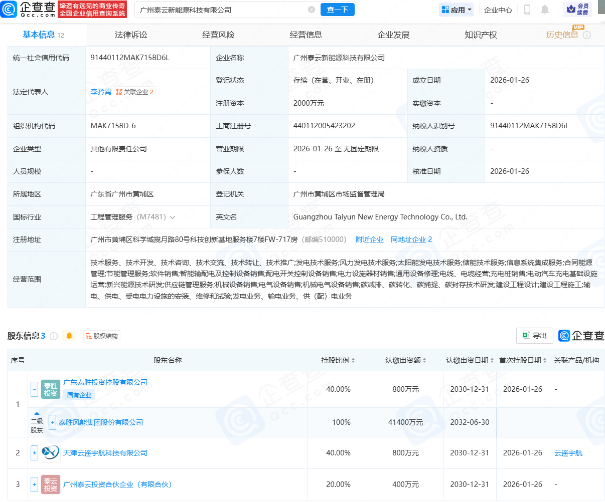 企查查APP显示,近日,广州泰云新能源科技有限公司成立,法定代表人为李矜霄,注册资本为2000万元,经营范围包含:发电技术服务;风力发电技术服务;太阳能发电技术服务;储能技术服务;电气设备销售等。企查查股权穿透显示,该公司由泰胜风能(300129)全资子公司广东泰胜投资控股有限公司、天津云遥宇航科技有限公司等共同持股。