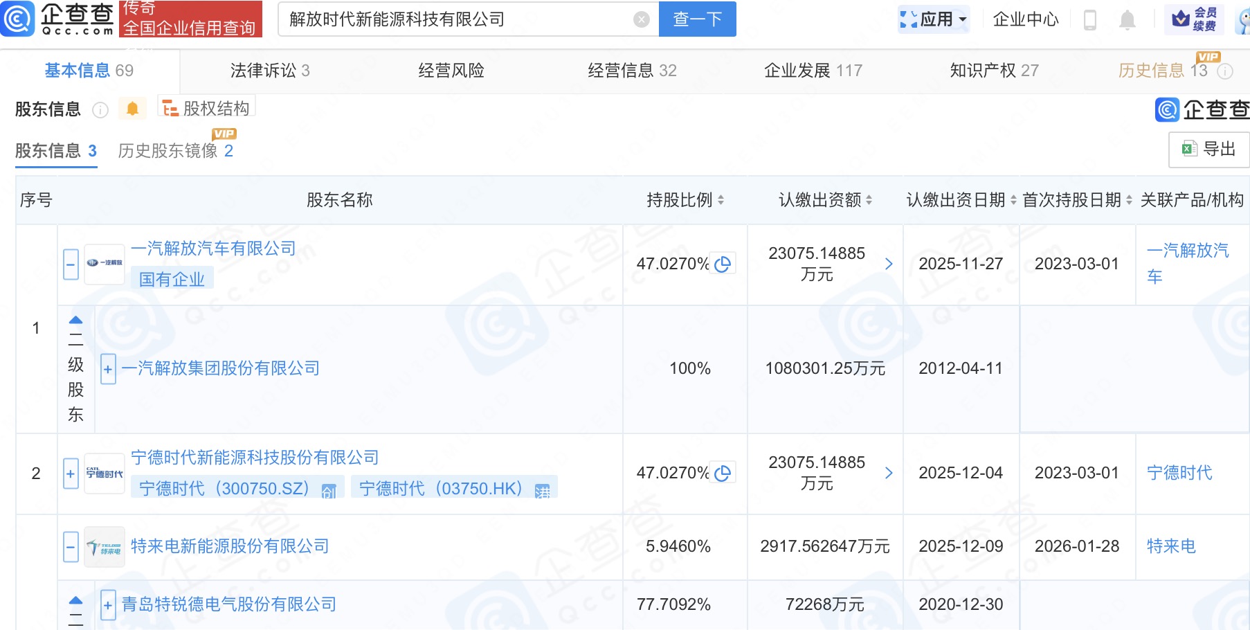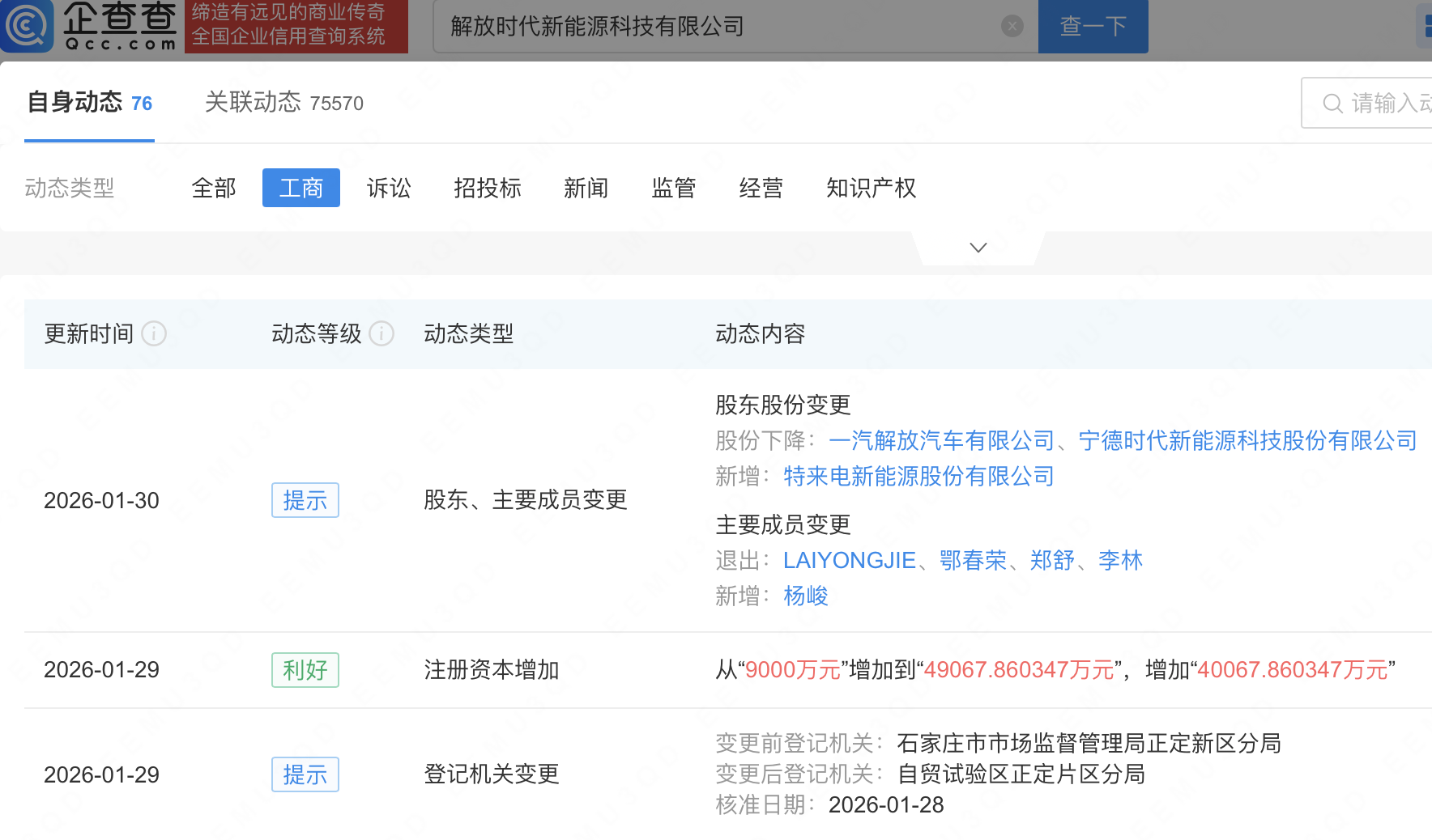 企查查APP显示,近日,解放时代新能源科技有限公司发生工商变更,新增特锐德(300001)旗下特来电新能源股份有限公司为股东,同时,注册资本由9000万元增至约4.9亿元。企查查信息显示,该公司成立于2023年,经营范围包括新能源汽车整车销售、电池销售、电池零配件销售等,现由一汽解放(000800)全资子公司一汽解放汽车有限公司、宁德时代(300750)及上述新增股东共同持股。