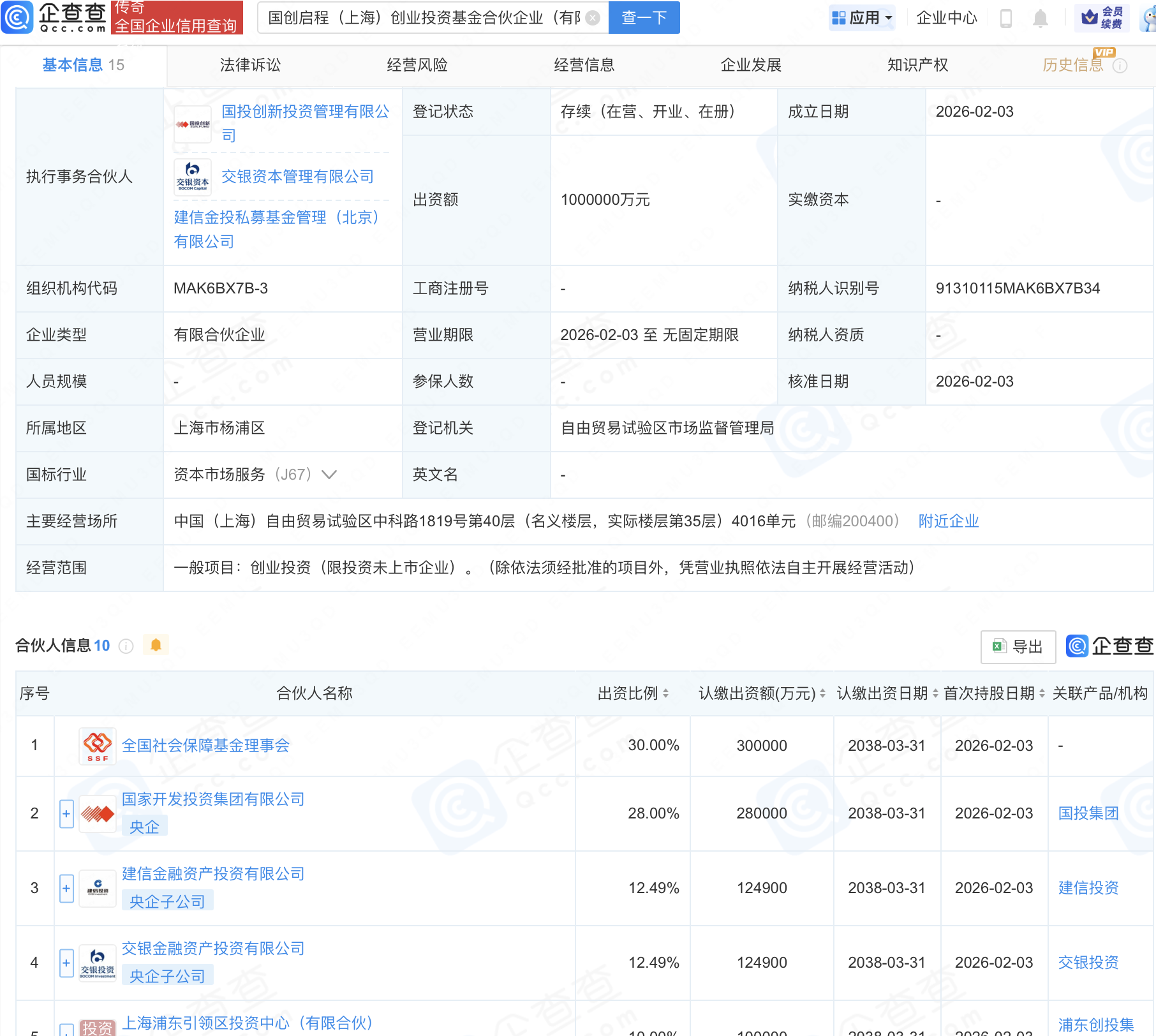 企查查APP显示,近日,国创启程(上海)创业投资基金合伙企业(有限合伙)成立,出资额100亿元,经营范围包含:创业投资(限投资未上市企业)。企查查股权穿透显示,该企业由全国社会保障基金理事会、国家开发投资集团有限公司等共同出资。