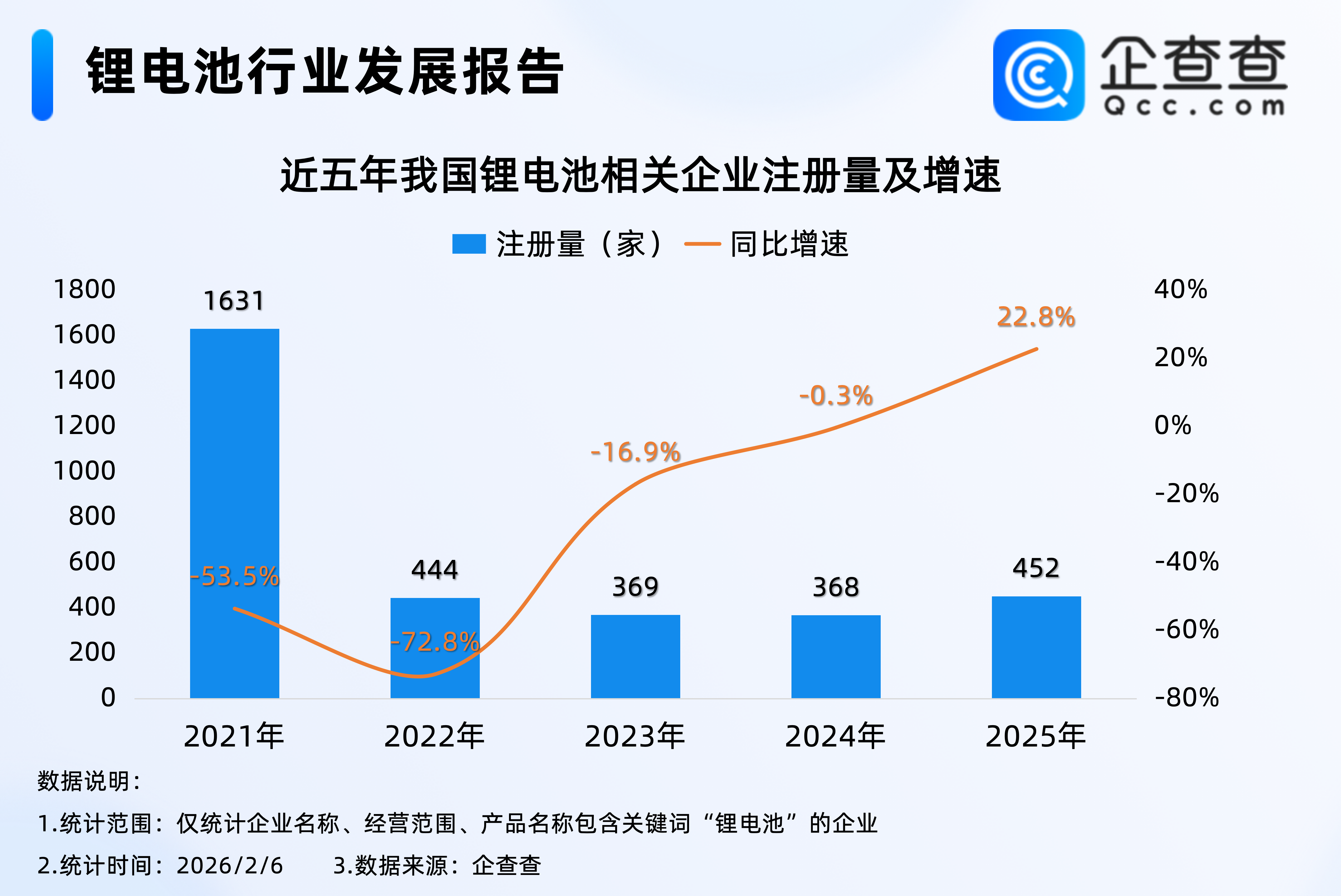 企查查数据显示,2022年至2025年,我国锂电池相关企业注册量保持在360家至460家之间,2025年全年,我国累计注册452家锂电池相关企业,相比2024年同期增加22.8%。截至2月6日,2026年我国已注册49家锂电池相关企业。