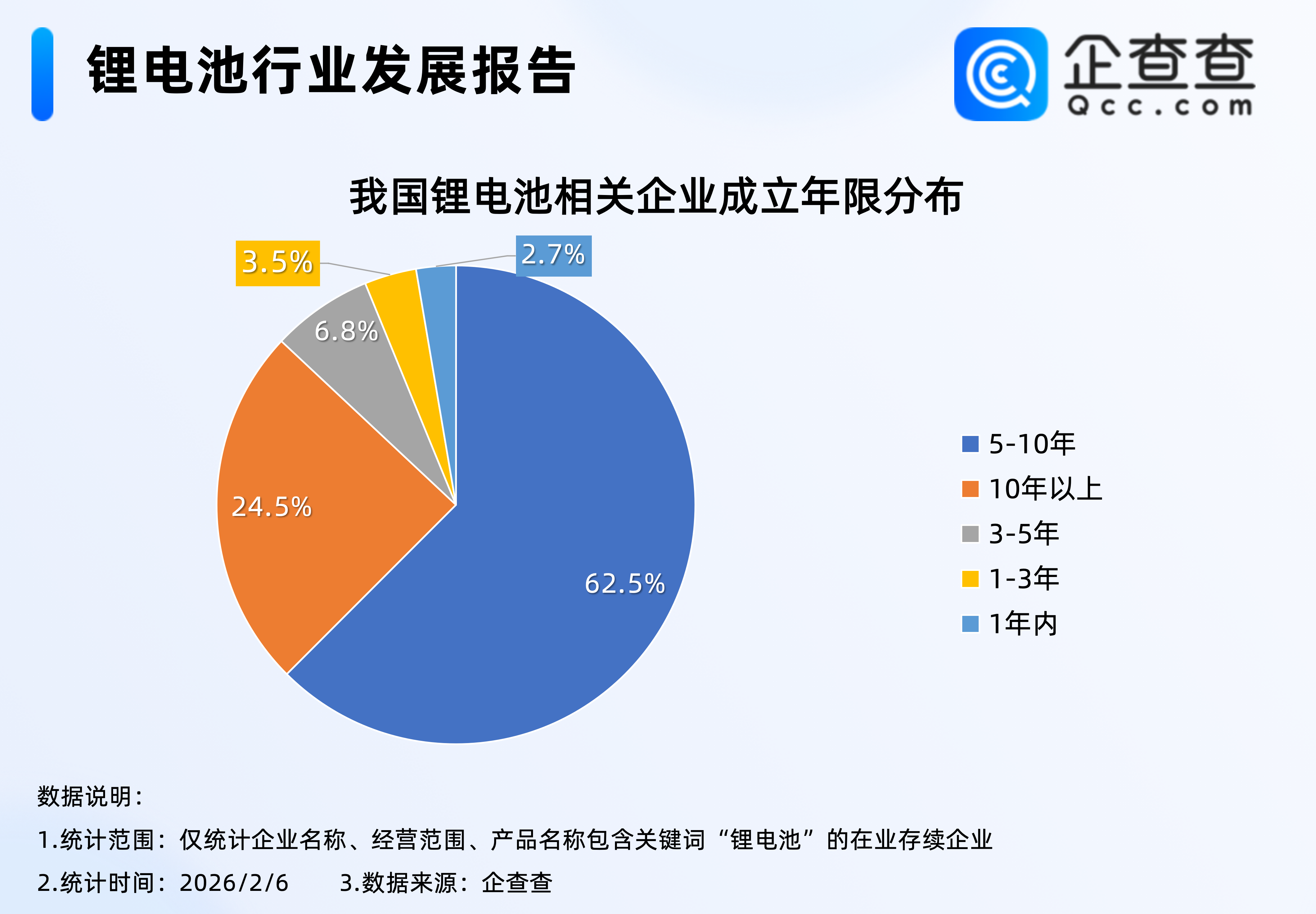企查查数据显示,截至2月6日,我国现存1.7万家锂电池相关企业,从成立年限上看,我国锂电池领域以老牌企业为主,近九成企业成立超5年,其中成立5至10年之间的企业占比62.5%,成立超10年的企业占比24.5%。