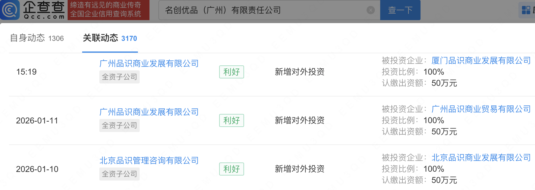 企查查APP显示,近日,北京品识商业发展有限公司、广州品识商业贸易有限公司、厦门品识商业发展有限公司成立,法定代表人同为周书。企查查股权穿透显示,三者皆由名创优品(广州)有限责任公司间接全资持股。