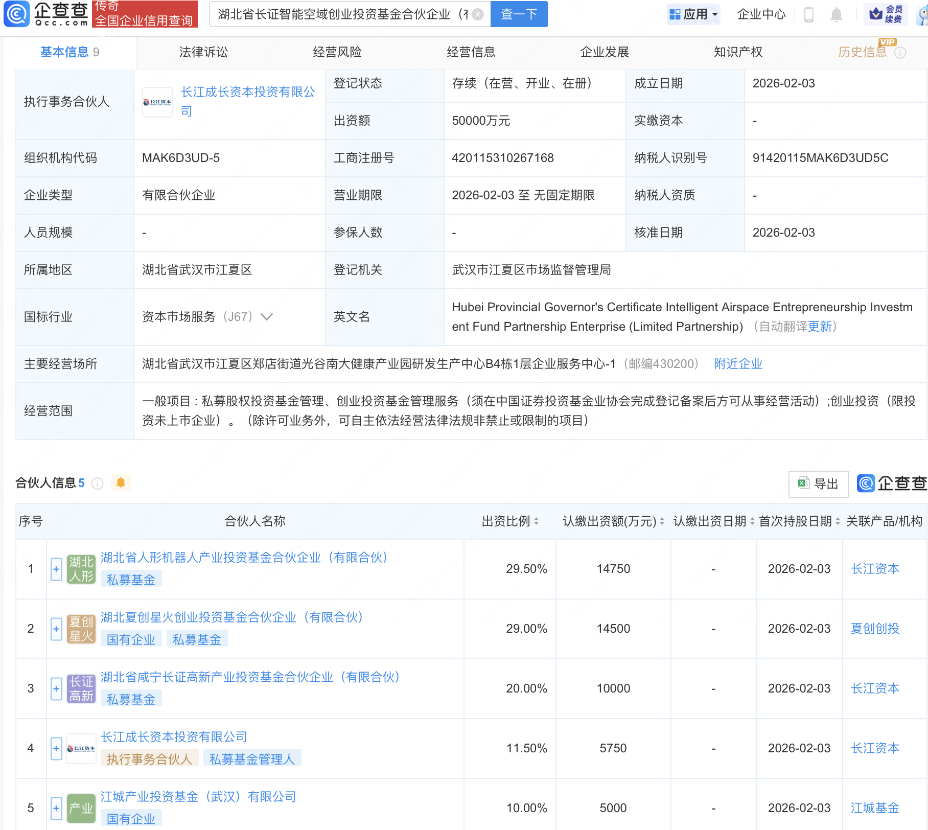 企查查APP显示,近日,湖北省长证智能空域创业投资基金合伙企业(有限合伙)成立,出资额5亿元,经营范围包含:私募股权投资基金管理、创业投资基金管理服务;创业投资(限投资未上市企业)。企查查股权穿透显示,该企业由湖北省人形机器人产业投资基金合伙企业(有限合伙)等共同出资。