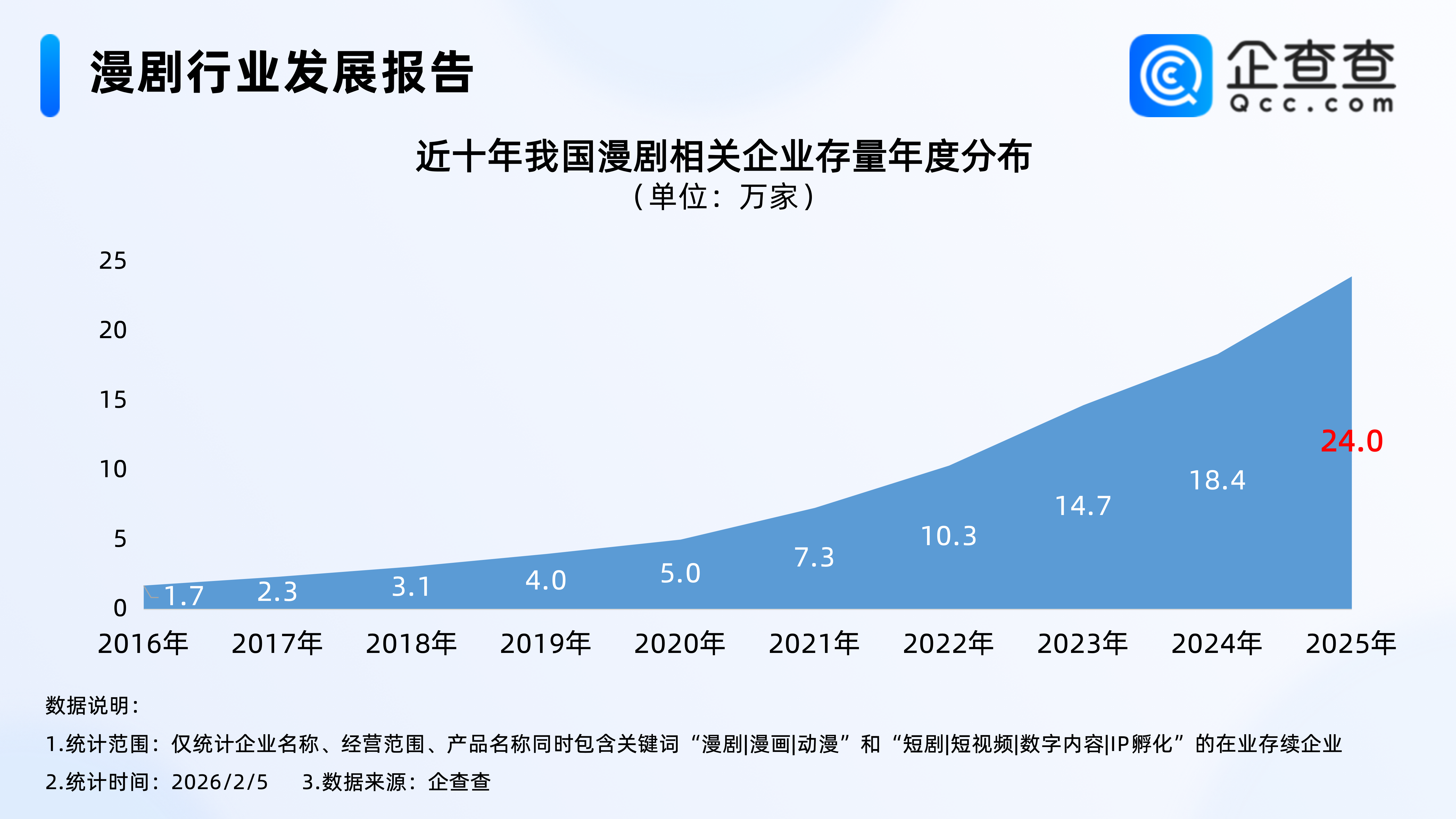 企查查数据显示,近十年,我国漫剧相关企业存量逐年增加,2022年相关企业存量正式突破10万家,达10.3万家;2025年年底,我国在业存续24.0万家漫剧相关企业。截至2026年2月5日,我国现存24.5万家漫剧相关企业。