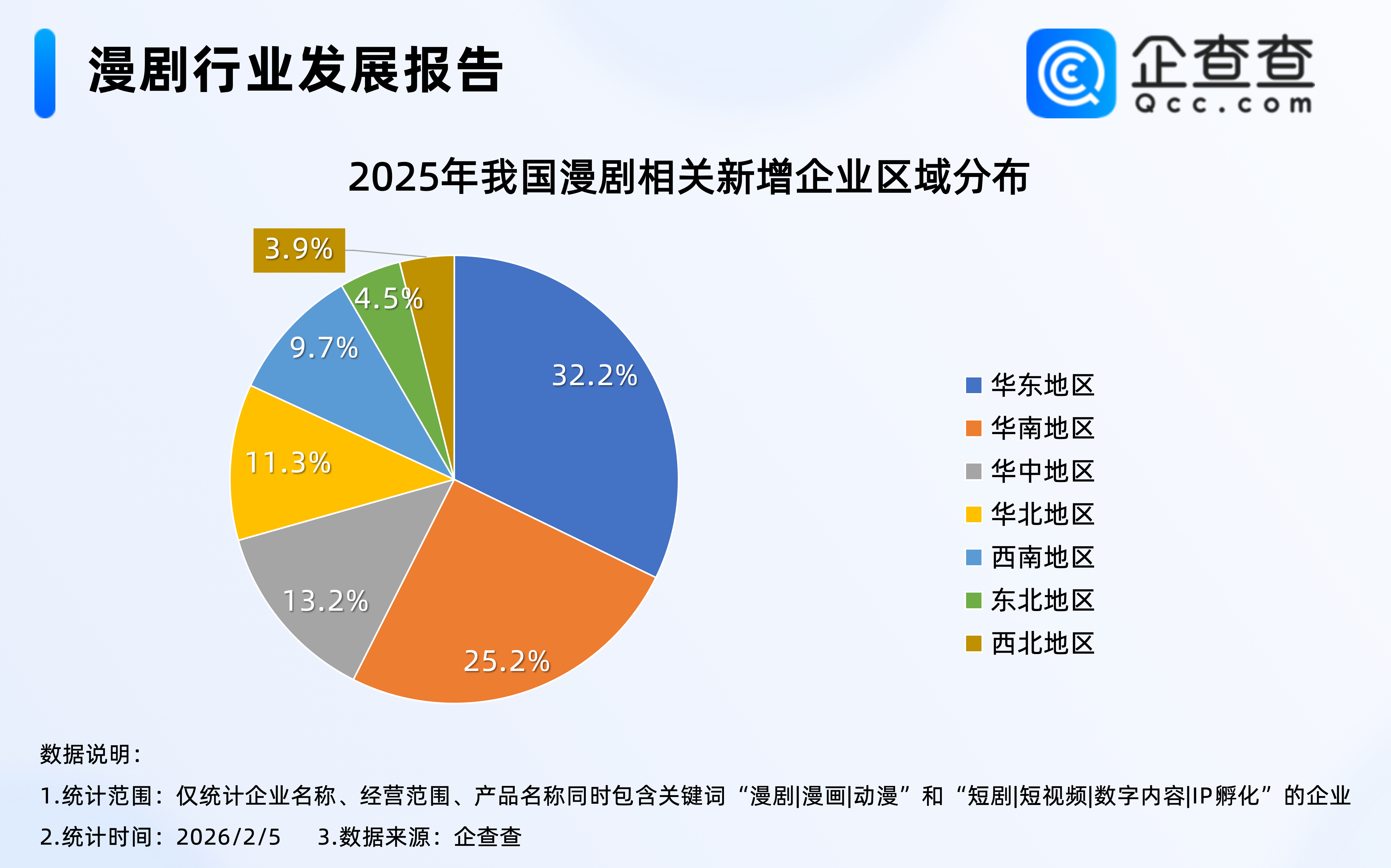 企查查数据显示,2025年注册的8万余家漫剧相关企业中,位于华东地区的相关企业最多,占比32.2%,其次是华南地区,占比25.2%,东北、西北地区相对较少,分占4.5%、3.9%。