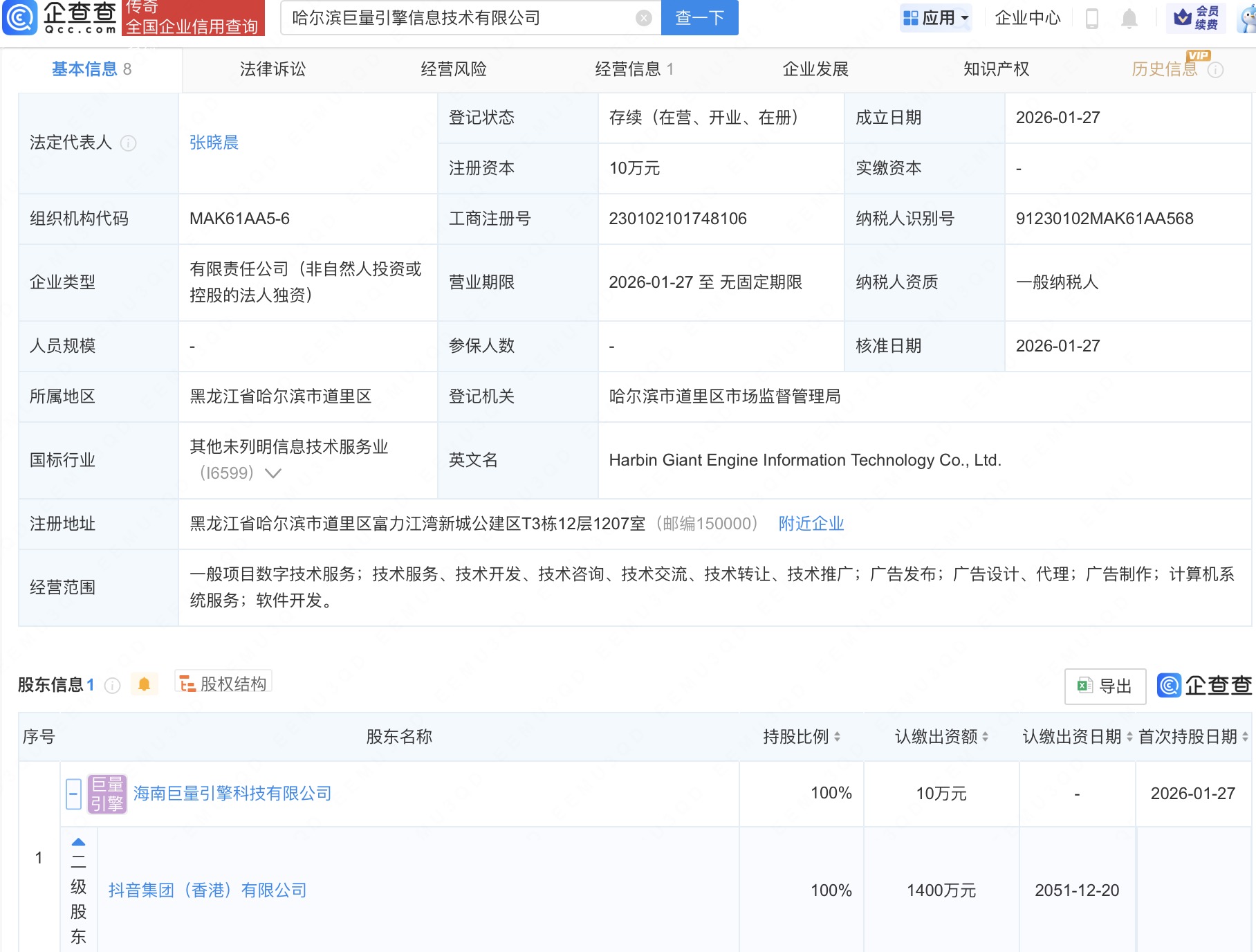 企查查APP显示,近日,哈尔滨巨量引擎信息技术有限公司成立,经营范围包含:数字技术服务;计算机系统服务;软件开发等。企查查股权穿透显示,该公司由抖音集团(香港)有限公司间接全资持股。