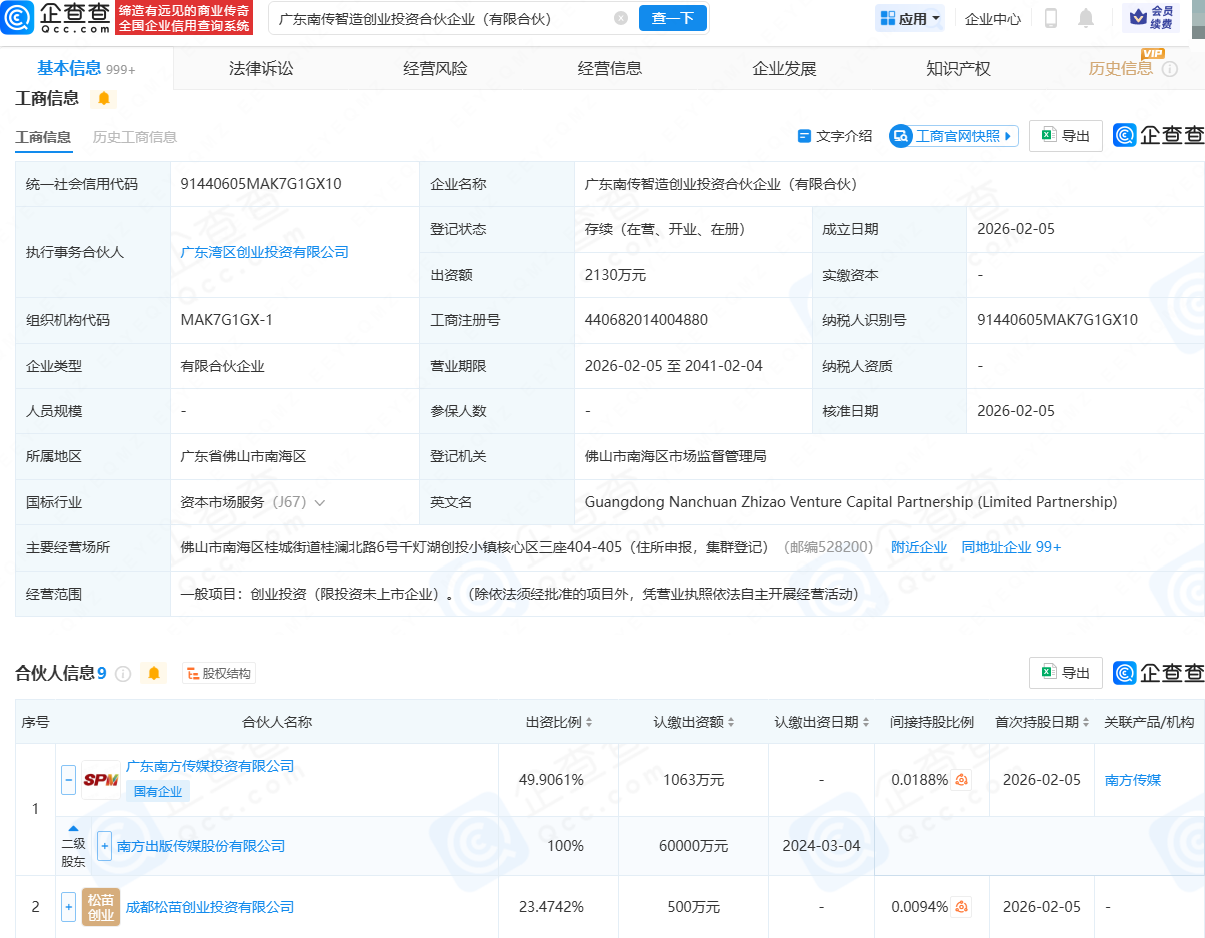 企查查APP显示,近日,广东南传智造创业投资合伙企业(有限合伙)成立,出资额2130万元,经营范围包含:创业投资(限投资未上市企业)。企查查股权穿透显示,该合伙企业由南方传媒(601900)全资子公司广东南方传媒投资有限公司、成都松苗创业投资有限公司等共同持股。