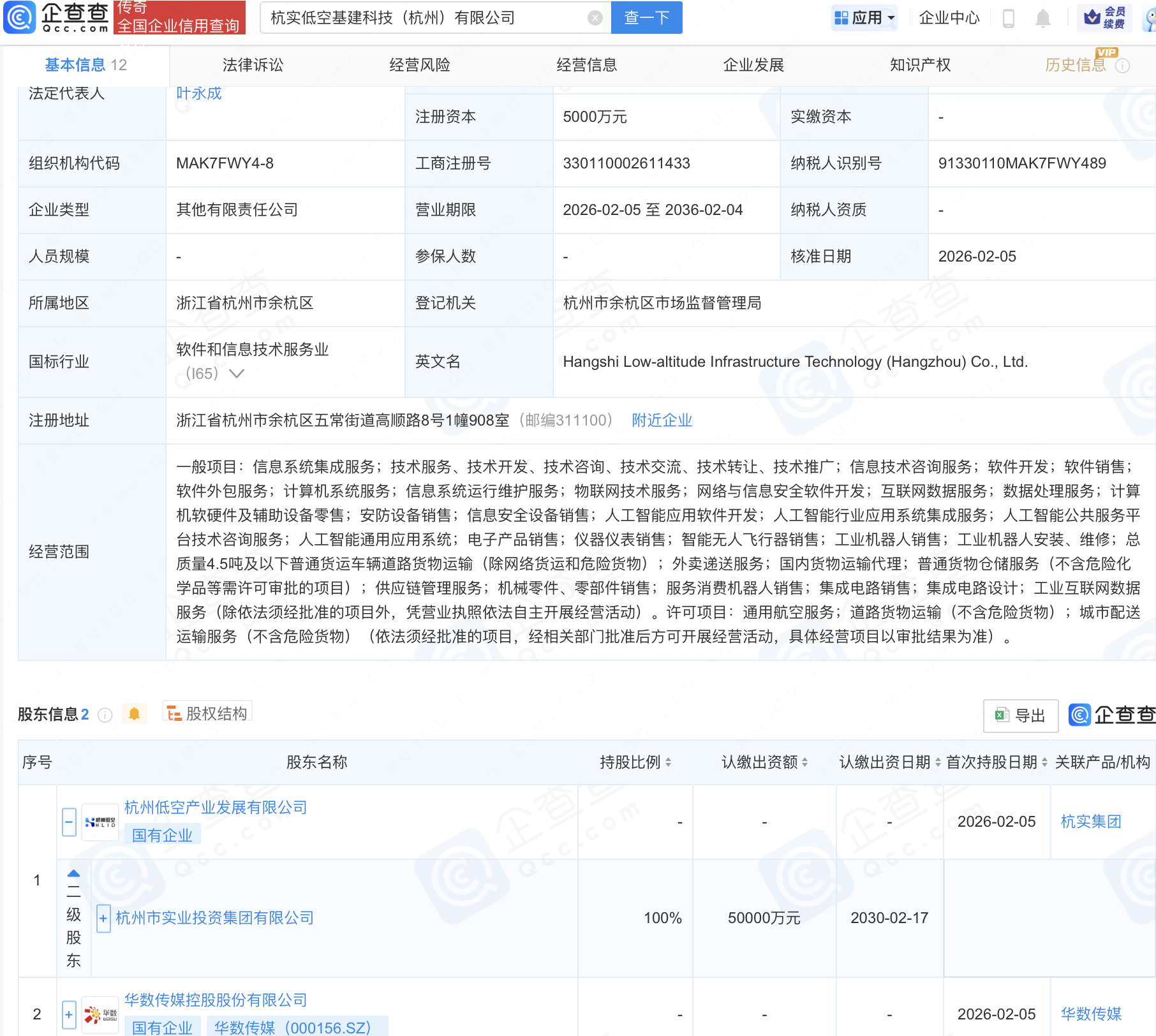 企查查APP显示,近日,杭实低空基建科技(杭州)有限公司成立,注册资本5000万元,经营范围包含:人工智能应用软件开发;人工智能行业应用系统集成服务;人工智能公共服务平台技术咨询服务等。企查查股权穿透显示,该公司由杭州市实业投资集团有限公司全资子公司杭州低空产业发展有限公司、华数传媒(000156)共同持股。