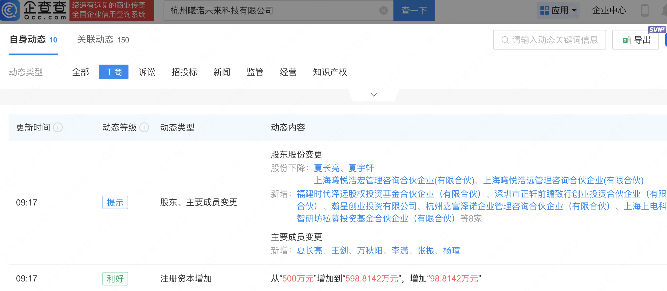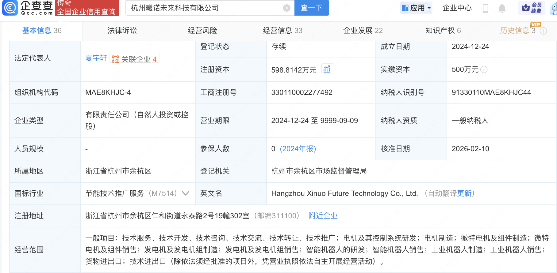企查查APP显示,近日,杭州曦诺未来科技有限公司发生工商变更,新增小米关联公司瀚星创业投资有限公司等为股东,同时注册资本增至598.81万元。企查查信息显示,该公司成立于2024年,经营范围包含:智能机器人的研发;智能机器人销售;工业机器人制造;工业机器人销售等。公开信息显示,曦诺未来是一家人形机器人领域的核心零部件供应商,专注高自由度灵巧手、行星滚柱丝杠微型电缸、高扭矩密度一体化关节模组的研发、生产与销售。