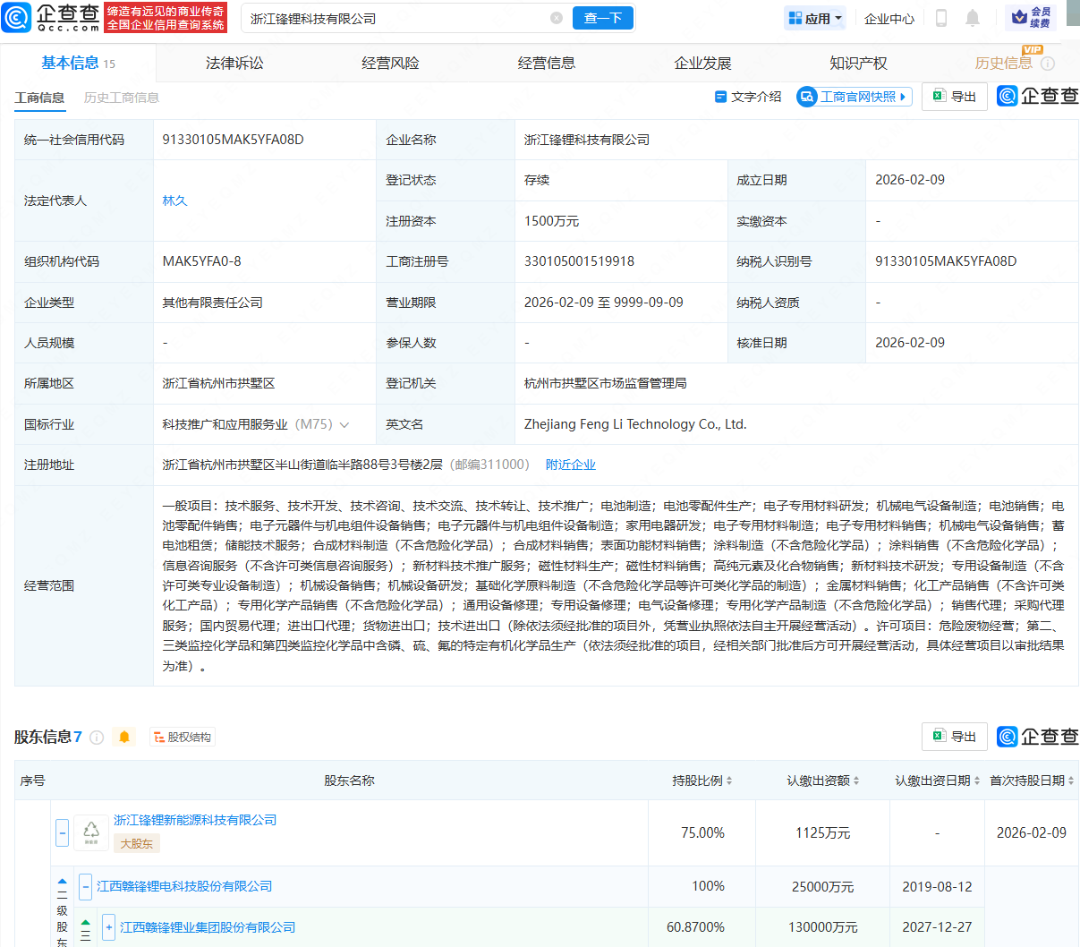 企查查APP显示,近日,浙江锋锂科技有限公司成立,法定代表人为林久,注册资本为1500万元,经营范围包含:电池制造;电池零配件生产;电子专用材料研发;机械电气设备制造;电池销售;磁性材料生产等。企查查股权穿透显示,该公司由赣锋锂业(002460)旗下浙江锋锂新能源科技有限公司等共同持股。