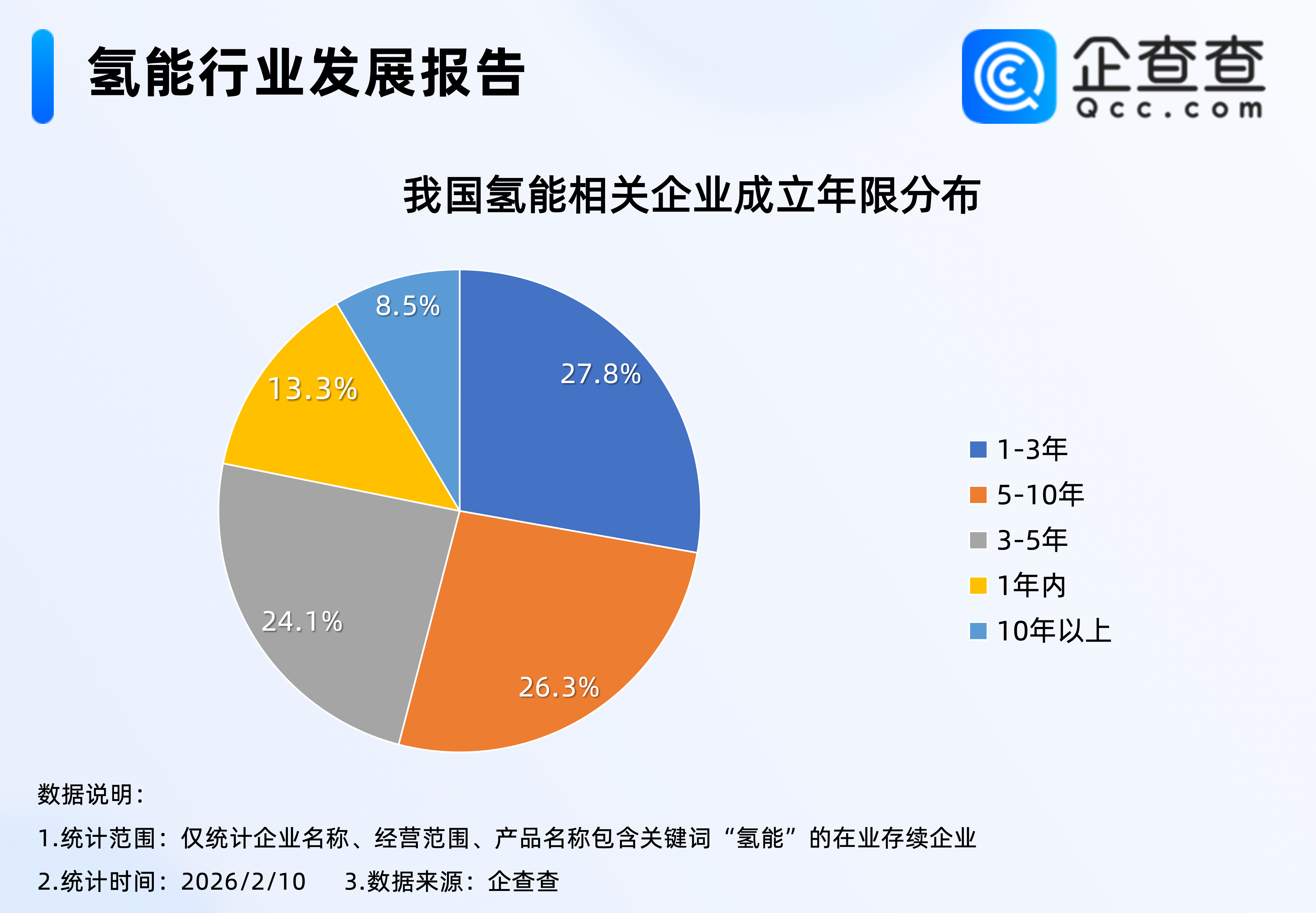 企查查数据显示,成立年限上,成立1至3年之间的氢能相关企业最多,占比27.8%,其次是成立5至10年之间的企业,占比26.3%。2026年以来,我国已注册35家氢能相关企业。