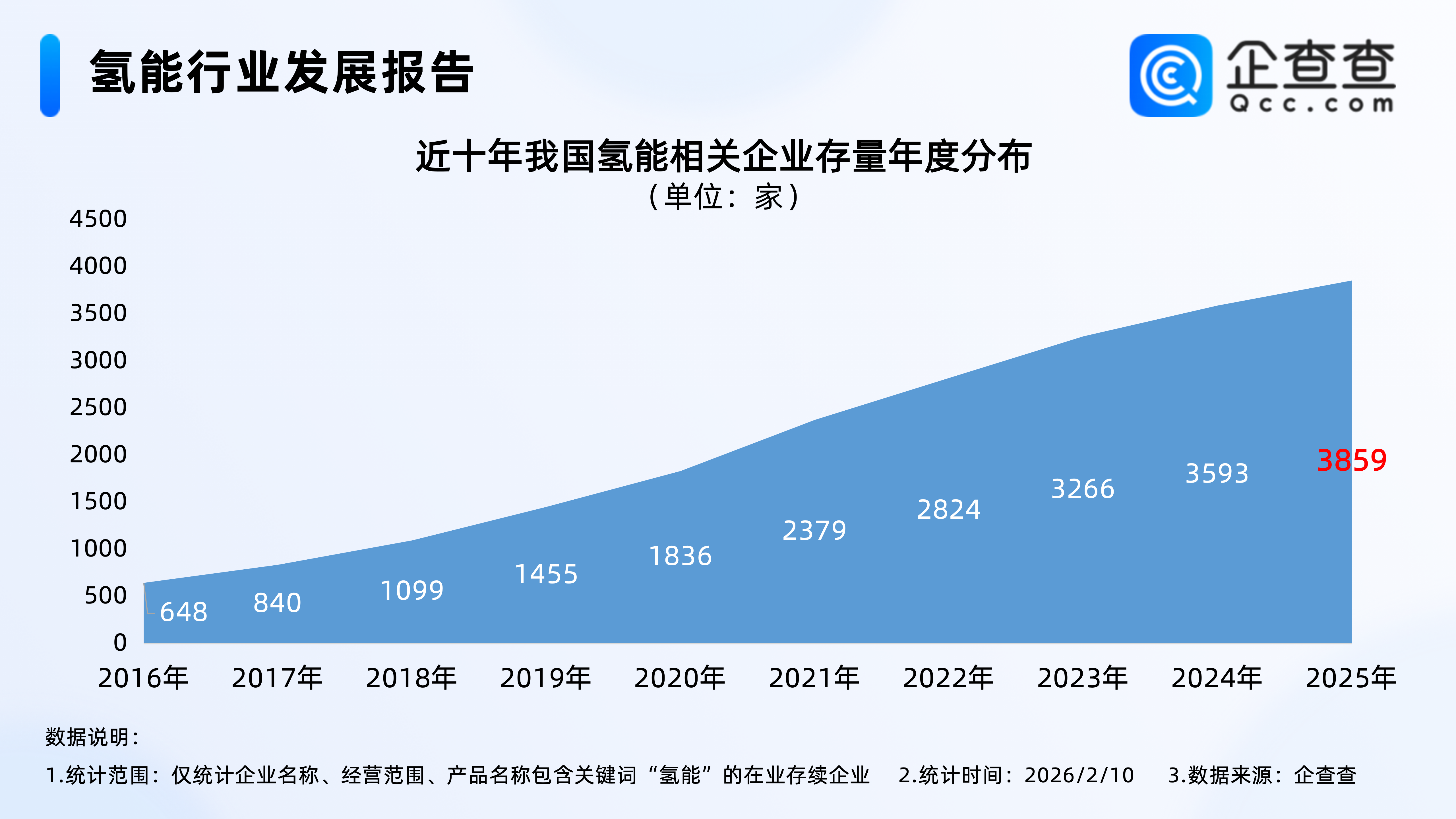 企查查数据显示,近十年,我国氢能相关企业存量逐年稳定增加,2025年年底,我国在业存续3859家氢能相关企业。截至2026年2月9日,我国现存3872家氢能相关企业。