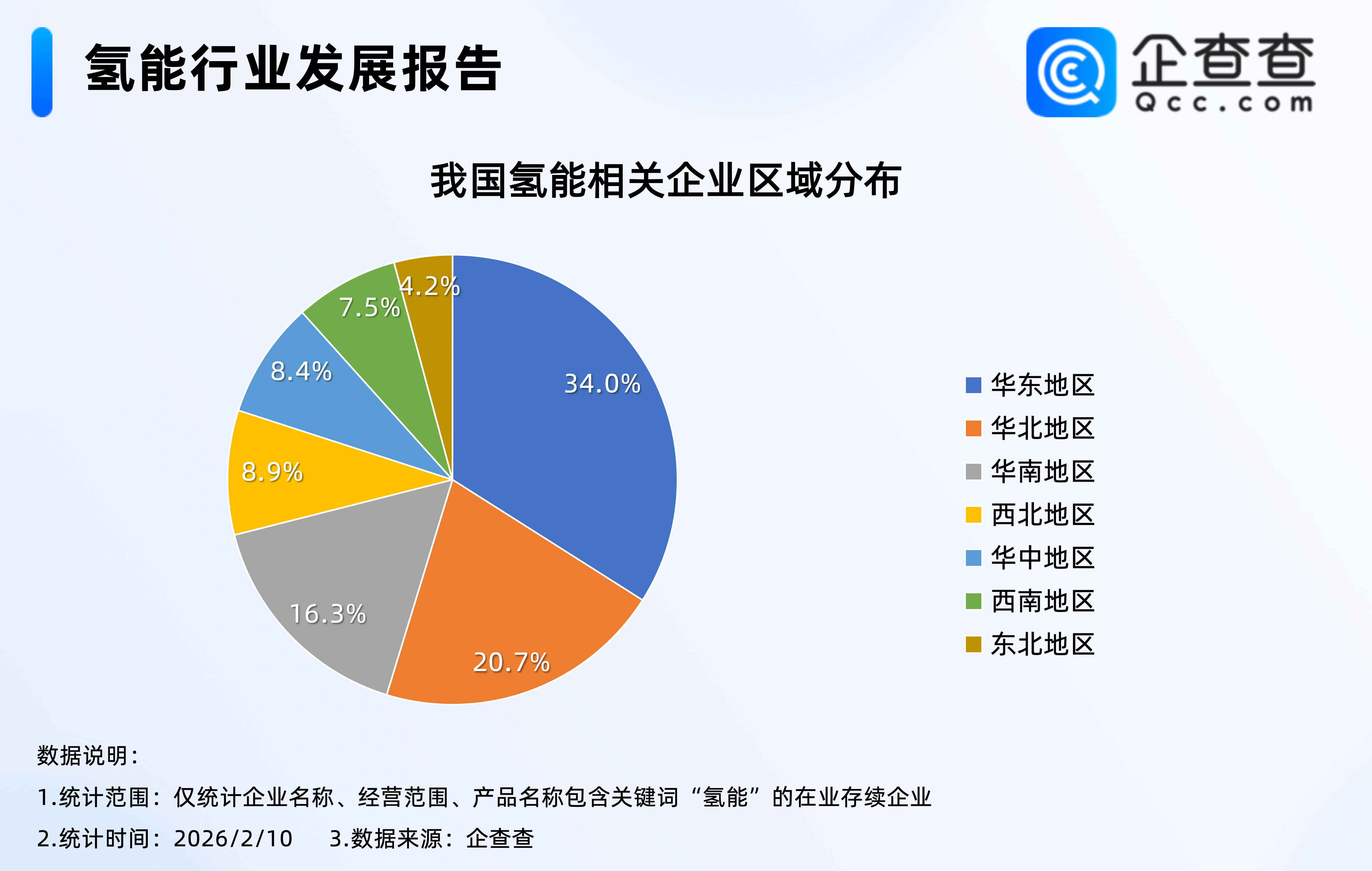 企查查数据显示,现存氢能相关企业区域分布上,位于华东地区的相关企业最多,占比34.0%,其次是华北地区,占比20.7%,西南、东北地区氢能相关企业存量相对最少,分别占比7.5%、4.2%。