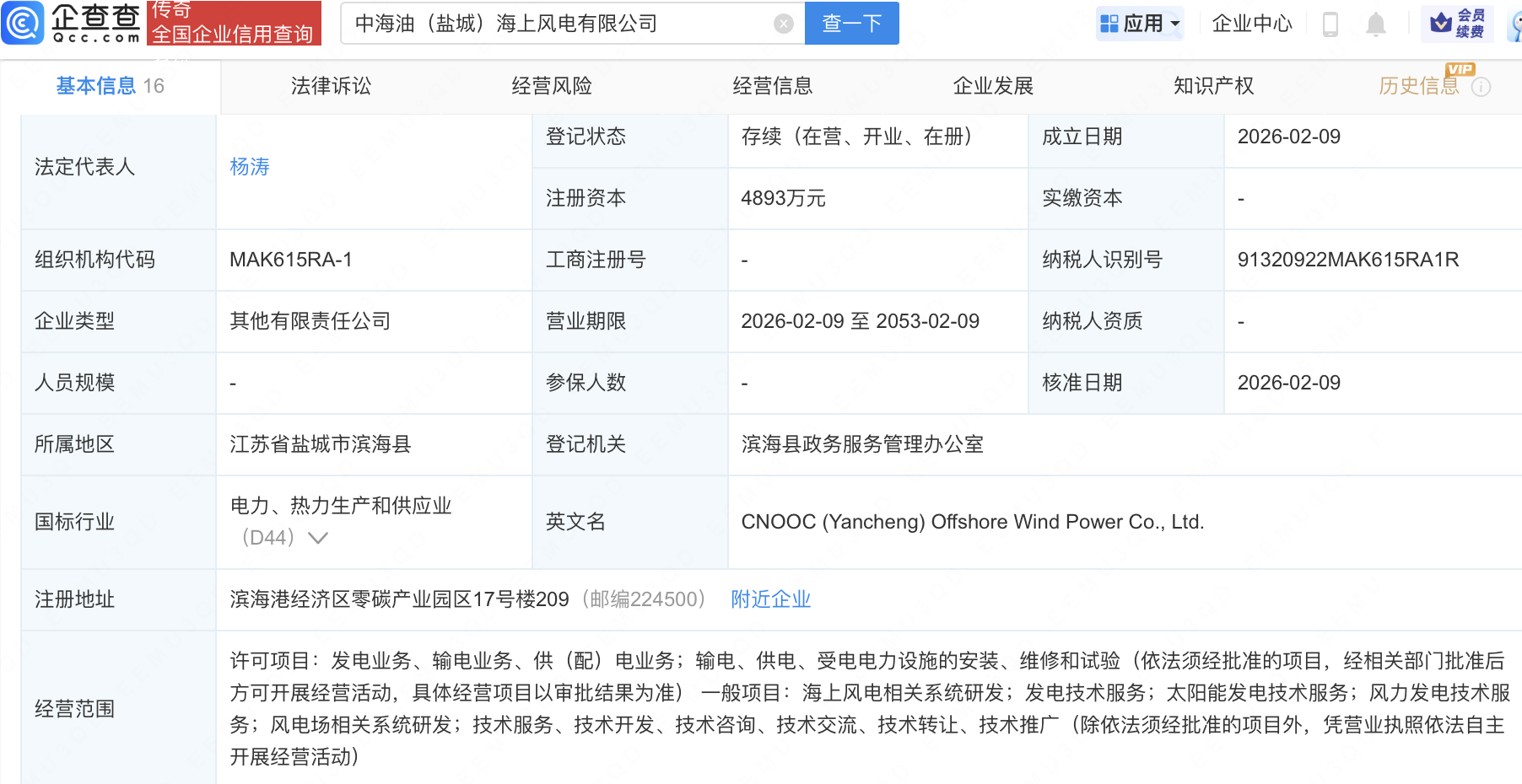 企查查APP显示,近日,中海油(盐城)海上风电有限公司成立,经营范围包含:海上风电相关系统研发;发电技术服务;太阳能发电技术服务;风力发电技术服务等。企查查股权穿透显示,该公司由中国海油(600938)旗下中海油融风能源有限公司、悦达投资(600805)、远景能源有限公司等共同持股。