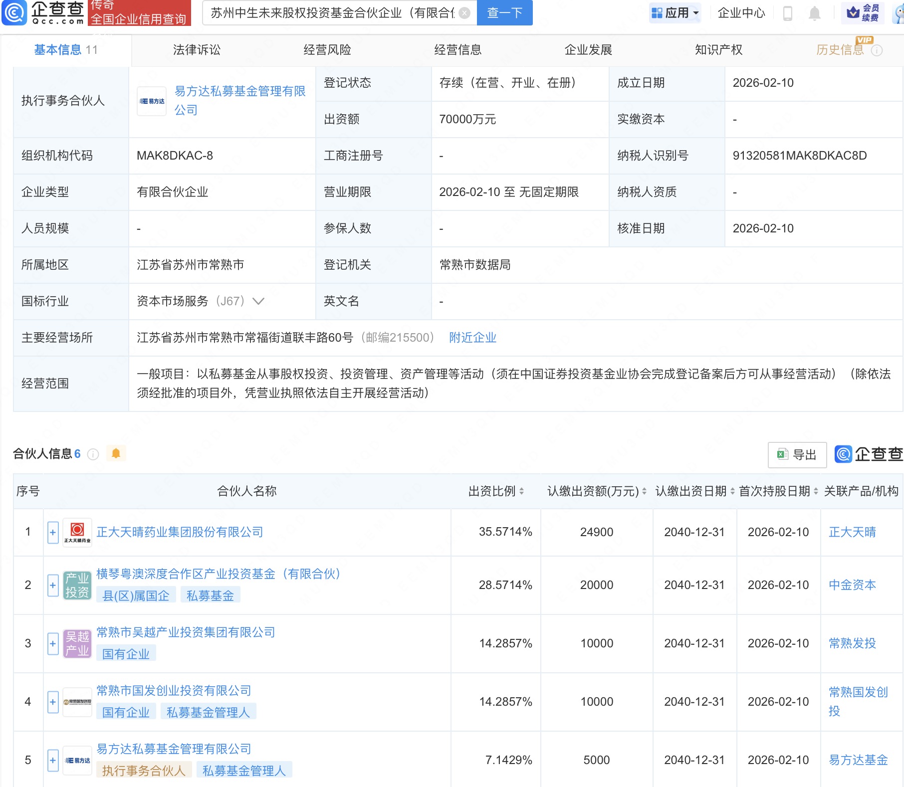 企查查APP显示,近日,苏州中生未来股权投资基金合伙企业(有限合伙)成立,出资额7亿人民币,经营范围为以私募基金从事股权投资、投资管理、资产管理等活动。企查查股权穿透显示,该企业由正大天晴药业集团股份有限公司、易方达私募基金管理有限公司等共同出资。