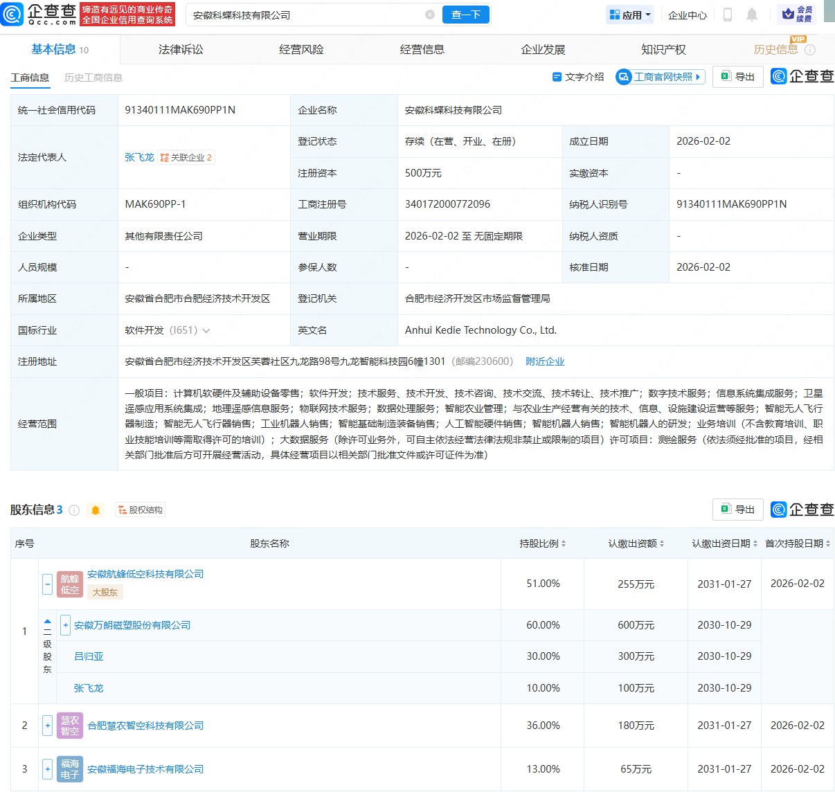 企查查APP显示,近日,安徽科蝶科技有限公司成立,法定代表人为张飞龙,经营范围包含:卫星遥感应用系统集成;地理遥感信息服务;智能无人飞行器制造;智能机器人销售;智能机器人的研发等。企查查股权穿透显示,该公司由万朗磁塑(603150)旗下安徽航蜂低空科技有限公司、合肥慧农智空科技有限公司等共同持股。
