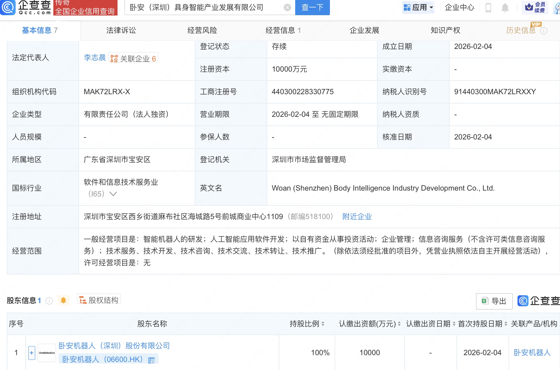 企查查APP显示,近日,卧安(深圳)具身智能产业发展有限公司成立,法定代表人为李志晨,注册资本1亿人民币,经营范围为智能机器人的研发,人工智能应用软件开发,以自有资金从事投资活动等。企查查股权穿透显示,该公司由卧安机器人(06600.HK)全资持股。