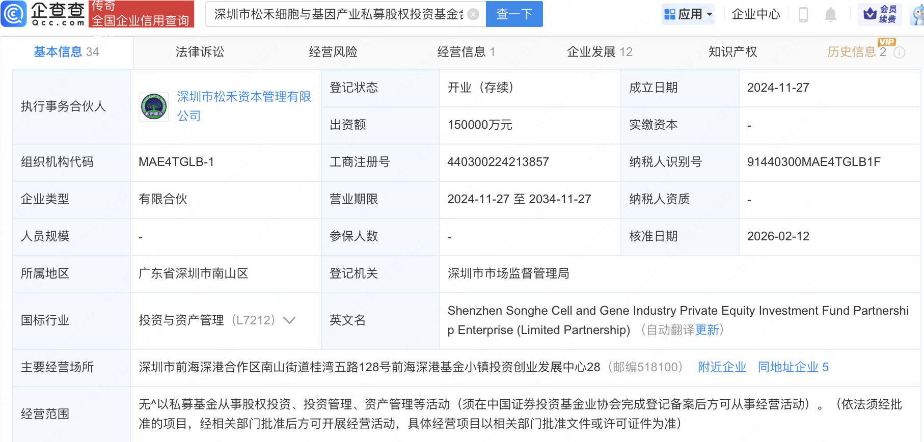 企查查APP显示,近日,深圳市松禾细胞与基因产业私募股权投资基金合伙企业(有限合伙)发生工商变更,新增博腾股份(300363)、信立泰(002294)、热景生物(688068)等为合伙人。企查查信息显示,该企业成立于2024年,出资额15亿元,经营范围包含:以私募基金从事股权投资、投资管理、资产管理等活动。