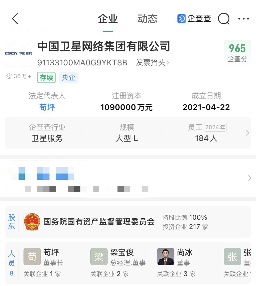 企查查显示,中国卫星网络集团有限公司成立于2021年4月,法定代表人为苟坪,由国务院国有资产监督管理委员会全资持股。
