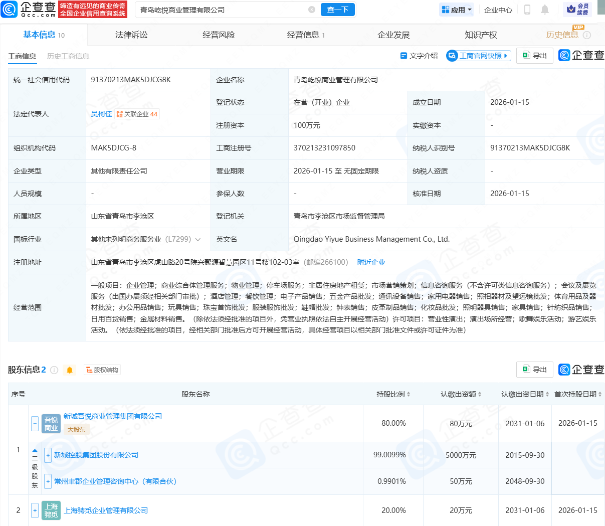 企查查APP显示,近日,青岛屹悦商业管理有限公司成立,法定代表人为吴柯佳,经营范围包含:企业管理;商业综合体管理服务;物业管理;酒店管理;餐饮管理;电子产品销售;游艺娱乐活动等。企查查股权穿透显示,该公司由新城控股(601155)旗下新城吾悦商业管理集团有限公司、上海骋觅企业管理有限公司共同持股。
