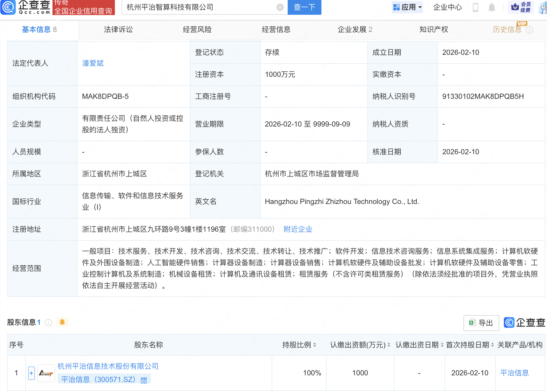 企查查APP显示,近日,杭州平治智算科技有限公司成立,注册资本1000万元,经营范围包含:信息系统集成服务;计算机软硬件及外围设备制造;人工智能硬件销售;计算器设备制造;计算器设备销售等。企查查股权穿透显示,该公司由平治信息(300571)全资持股。
