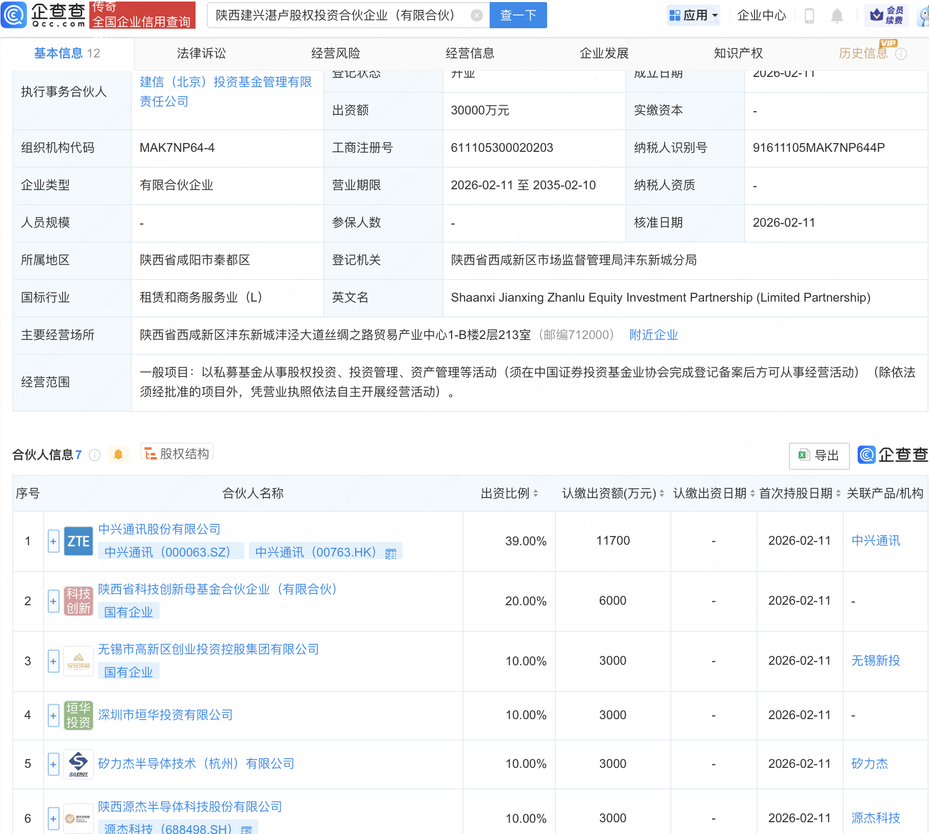 企查查APP显示,近日,陕西建兴湛卢股权投资合伙企业(有限合伙)成立,出资额3亿元,经营范围包含:以私募基金从事股权投资、投资管理、资产管理等活动。企查查股权穿透显示,该企业由中兴通讯(000063)、源杰科技(688498)等共同出资。