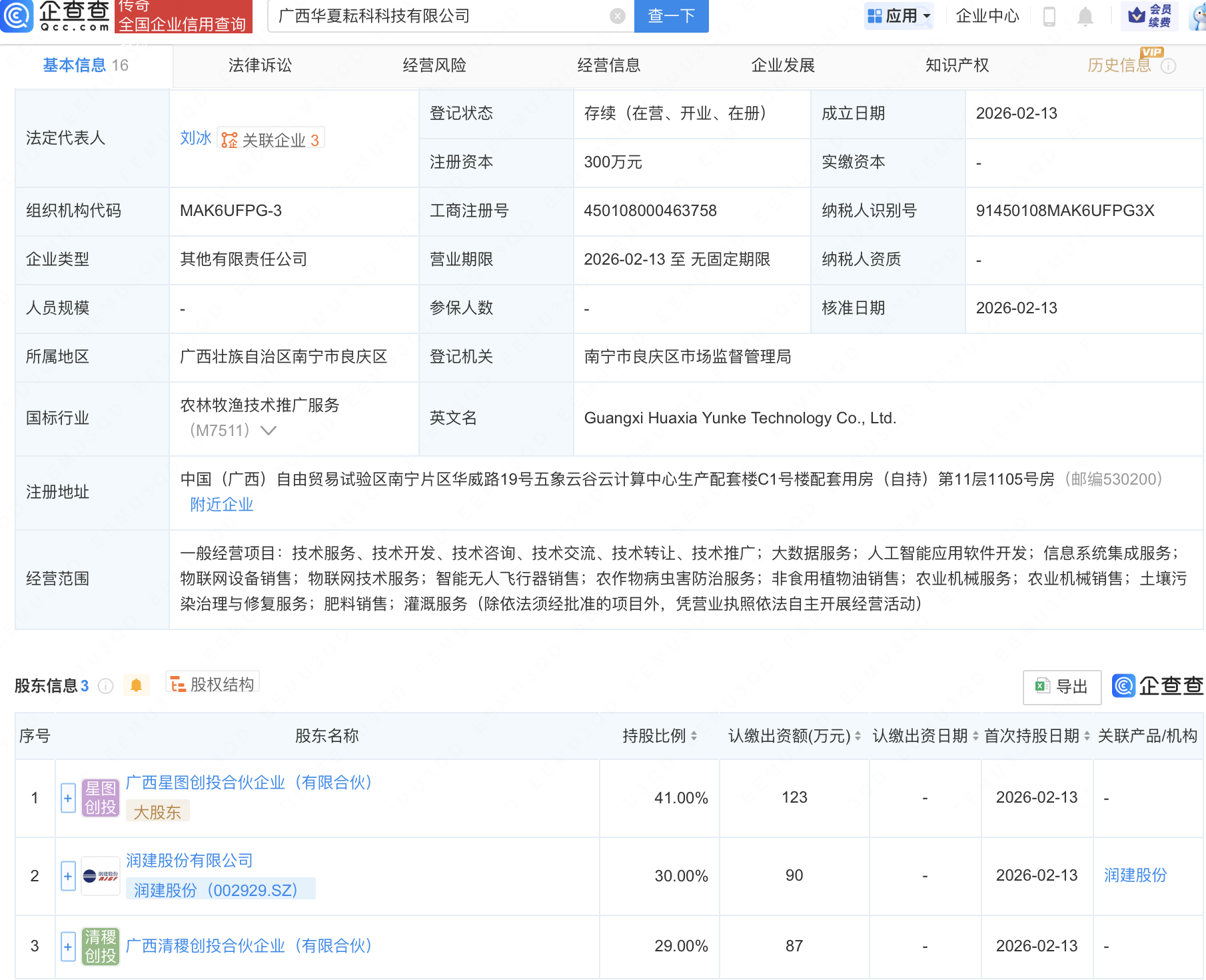 企查查APP显示,近日,广西华夏耘科科技有限公司成立,经营范围包含:人工智能应用软件开发;信息系统集成服务;物联网设备销售;物联网技术服务;智能无人飞行器销售等。企查查股权穿透显示,该公司由润建股份(002929)等共同持股。
