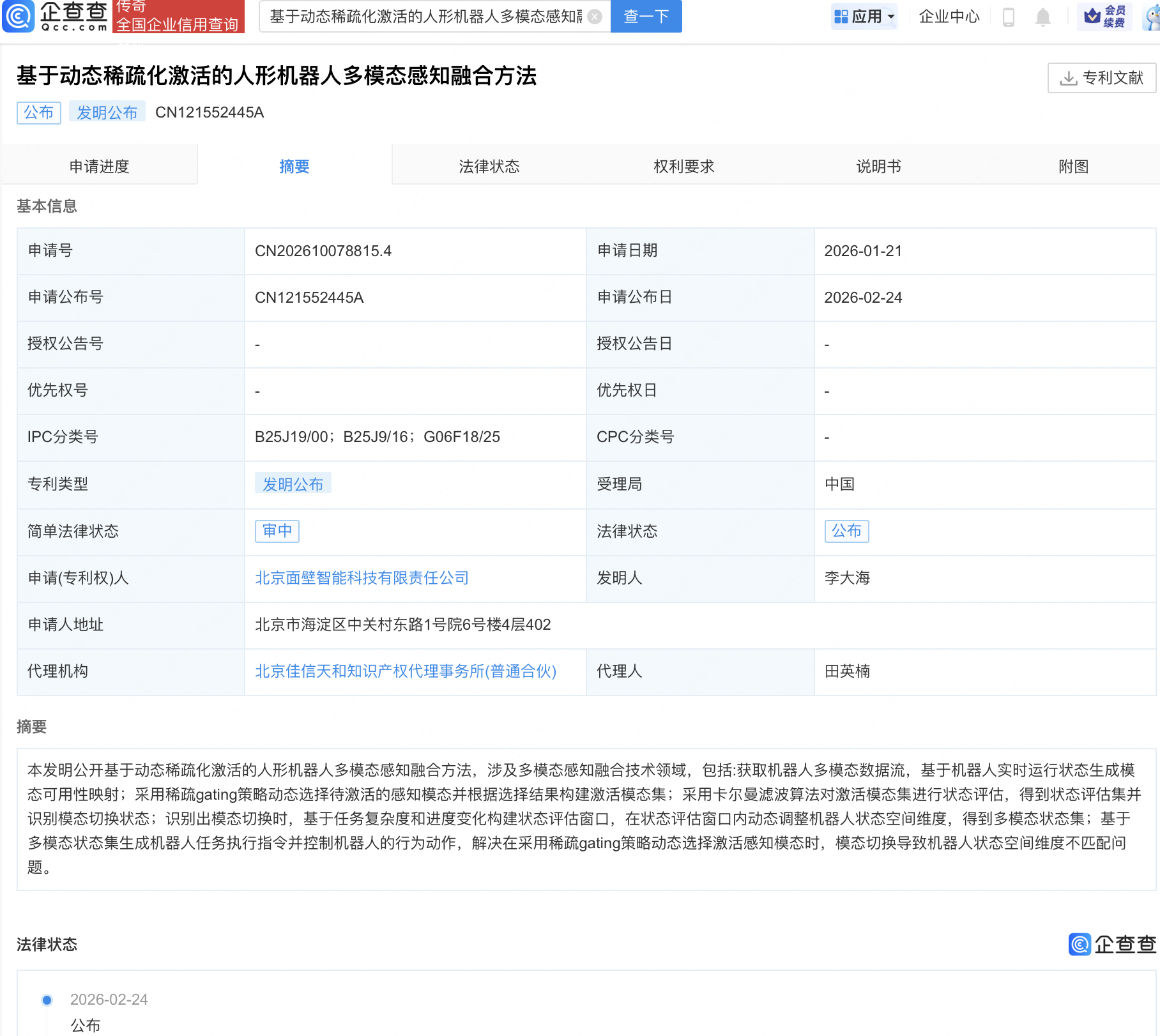 企查查APP显示,近日,北京面壁智能科技有限责任公司“基于动态稀疏化激活的人形机器人多模态感知融合方法”专利公布。企查查专利摘要显示,该方法包括:获取机器人多模态数据流,基于机器人实时运行状态生成模态可用性映射;采用稀疏gating策略动态选择待激活的感知模态并根据选择结果构建激活模态集;采用卡尔曼滤波算法对激活模态集进行状态评估,得到状态评估集并识别模态切换状态;识别出模态切换时,基于任务复杂度和进度变化构建状态评估窗口,在状态评估窗口内动态调整机器人状态空间维度,得到多模态状态集;基于多模态状态集生成机器人任务执行指令并控制机器人的行为动作,解决在采用稀疏gating策略动态选择激活感知模态时,模态切换导致机器人状态空间维度不匹配问题。