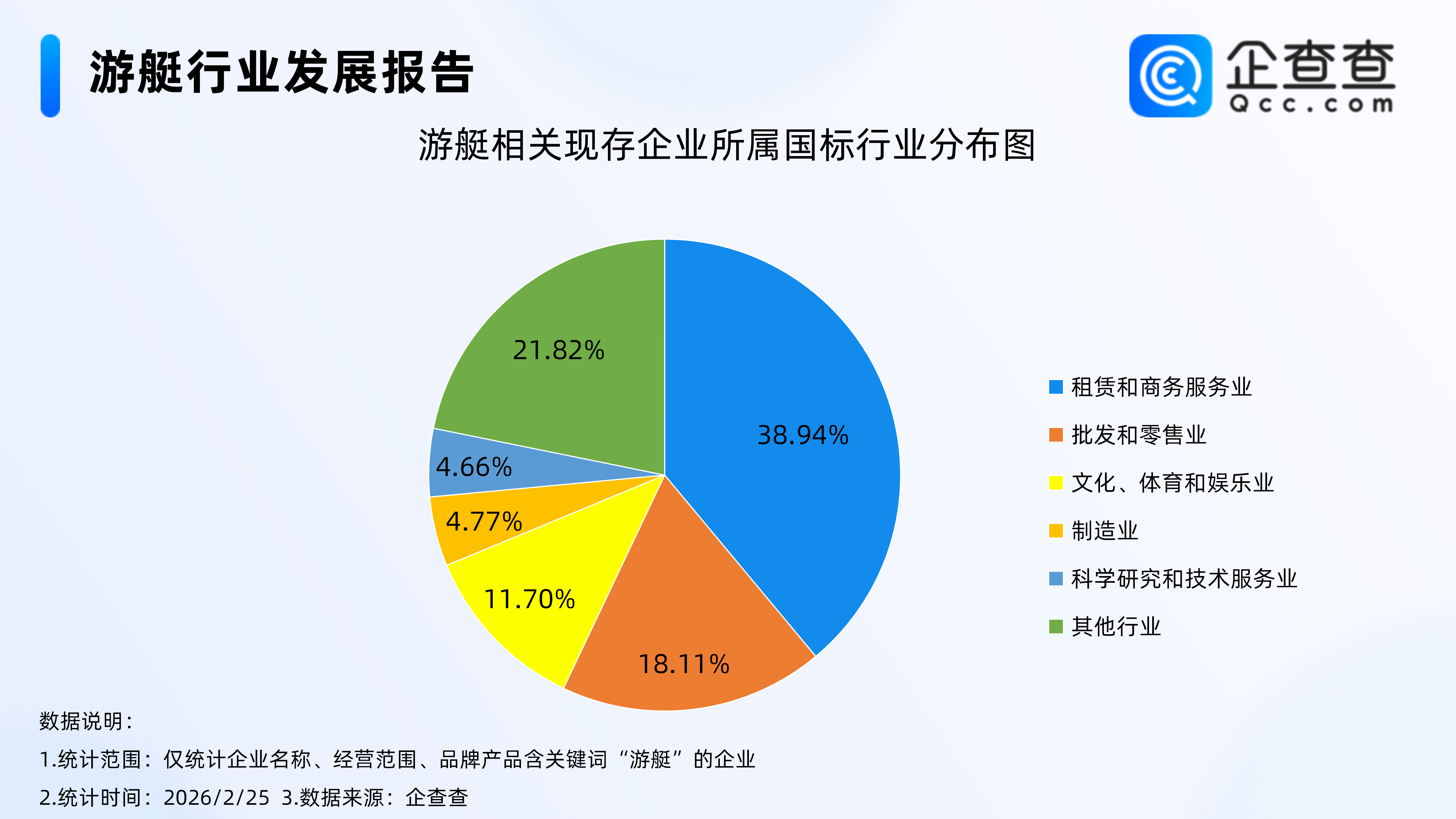 企查查数据显示,国标行业分布方面,归属于租赁和商务服务业的游艇相关企业最多,占比达38.94%,其次为批发和零售业,文化、体育和娱乐业,分别占比18.11%、11.7%。归属于制造业的游艇相关企业占比达4.77%。