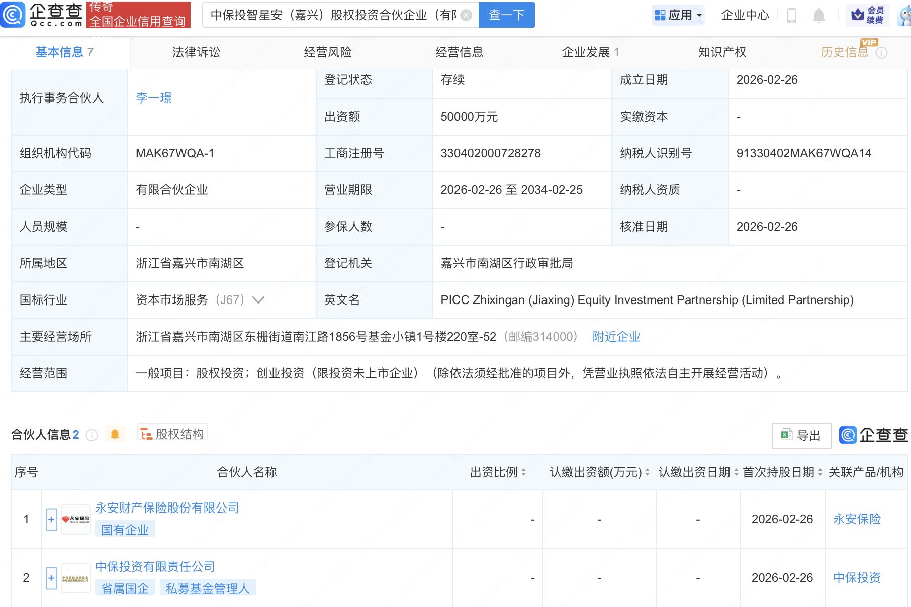 企查查APP显示,近日,中保投智星安(嘉兴)股权投资合伙企业(有限合伙)成立,出资额5亿人民币,经营范围为股权投资、创业投资。企查查股权穿透显示,该企业由永安财产保险股份有限公司、中保投资有限责任公司共同出资。