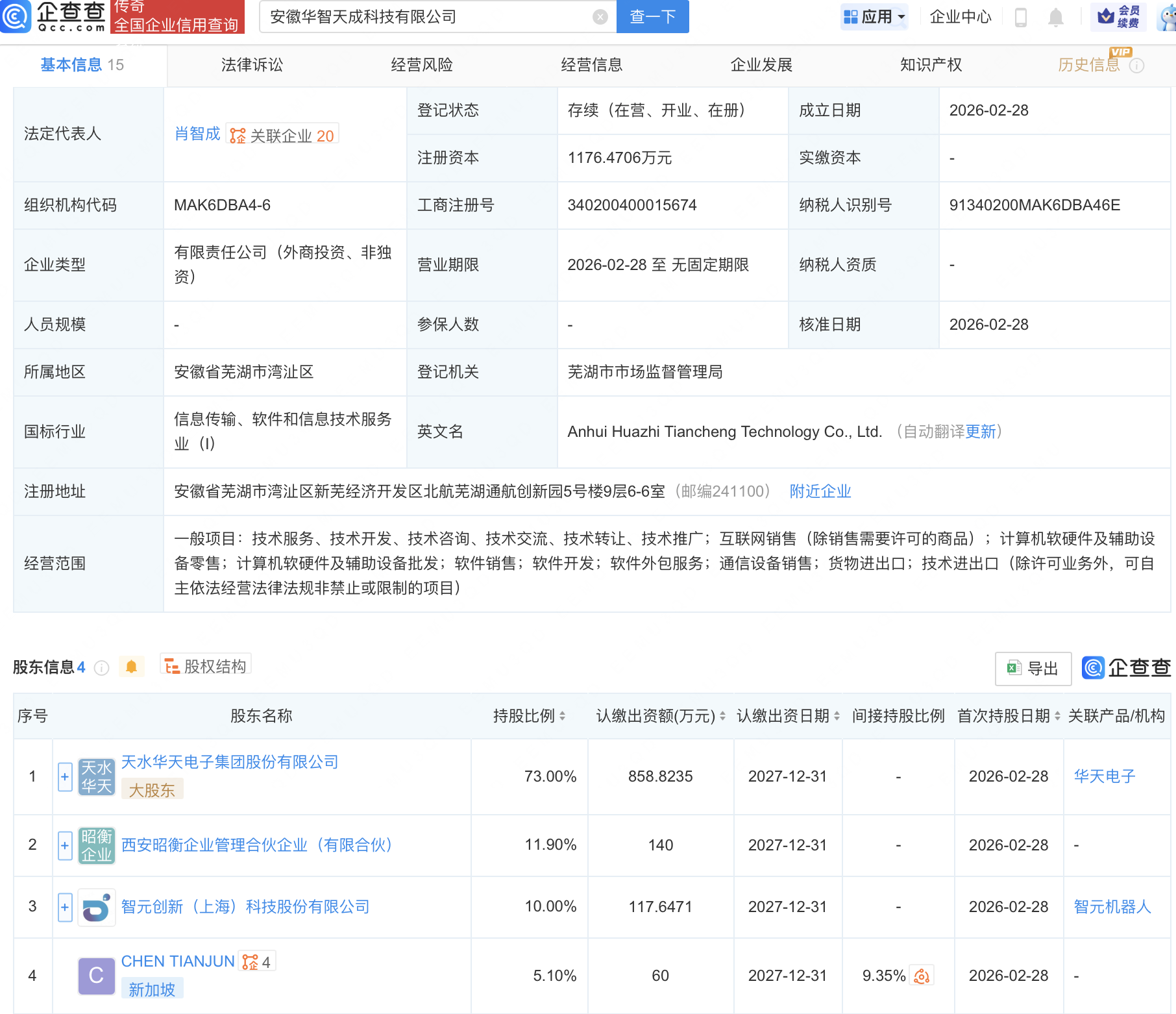 企查查APP显示,近日,安徽华智天成科技有限公司成立,法定代表人为肖智成,经营范围包含:计算机软硬件及辅助设备零售;计算机软硬件及辅助设备批发;软件销售;通信设备销售等。企查查股权穿透显示,该公司由智元机器人关联公司智元创新(上海)科技股份有限公司、天水华天电子集团股份有限公司等共同持股。