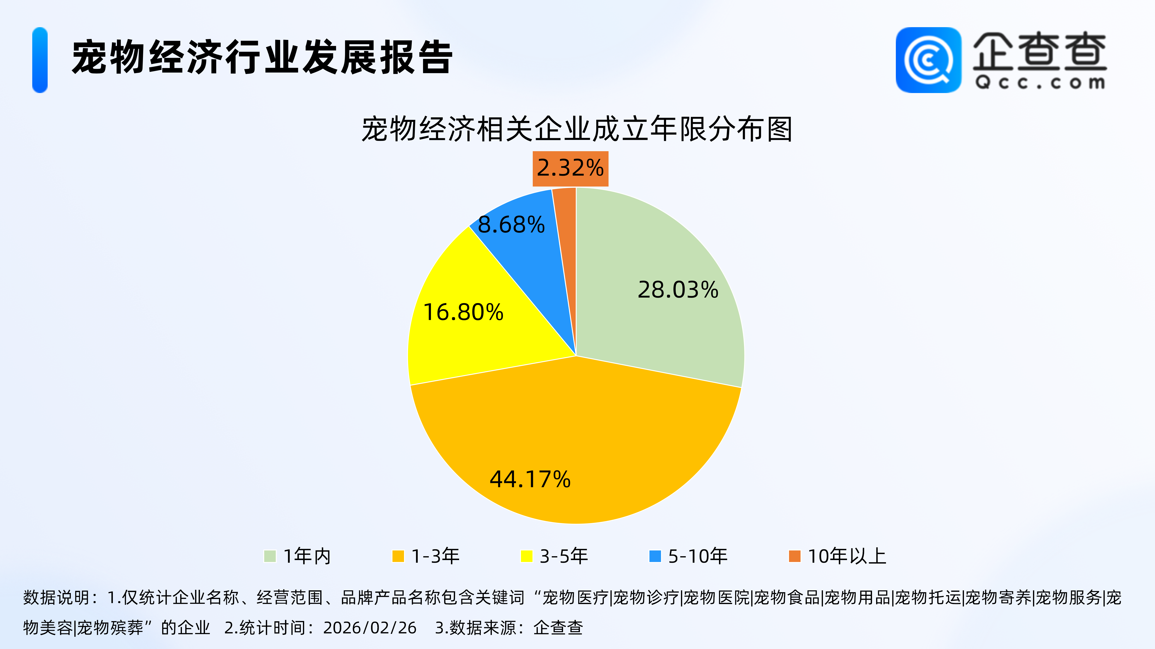 企查查数据显示,截至2月26日,国内现存宠物经济相关企业506.39万家。从经营时间来看,超7成相关企业成立于近三年,成立年限在1-3年的相关企业最多,占比44.17%,成立于1年内的相关企业占比28.03%。