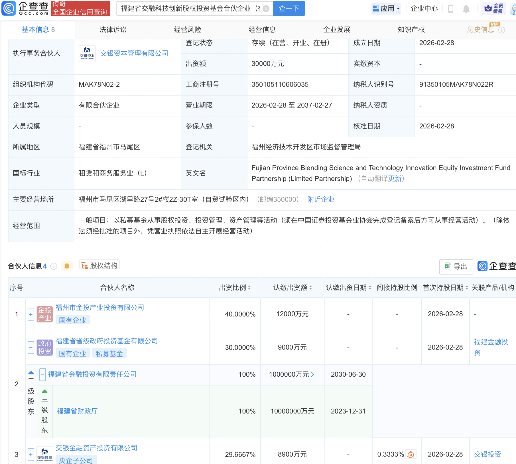 企查查APP显示,近日,福建省交融科技创新股权投资基金合伙企业(有限合伙)成立,经营范围包含:以私募基金从事股权投资、投资管理、资产管理等活动。企查查股权穿透显示,该企业由福建省省级政府投资基金有限公司、交银金融资产投资有限公司等共同出资。