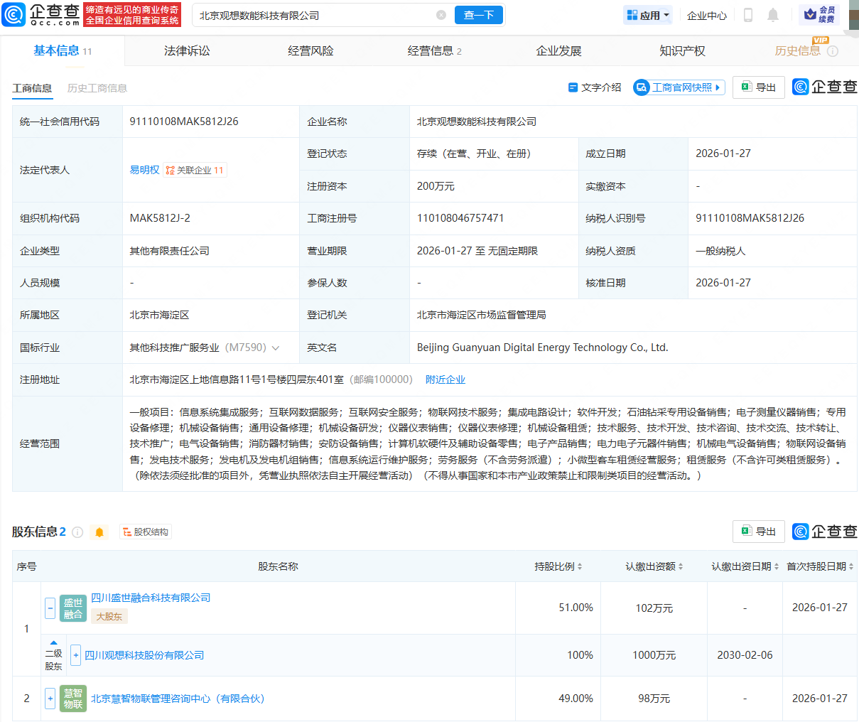 企查查APP显示,近日,北京观想数能科技有限公司成立,法定代表人为易明权,经营范围包含:物联网技术服务;集成电路设计;石油钻采专用设备销售;电子测量仪器销售;专用设备修理等。企查查股权穿透显示,该公司由观想科技(301213)全资子公司四川盛世融合科技有限公司、北京慧智物联管理咨询中心(有限合伙)共同持股。